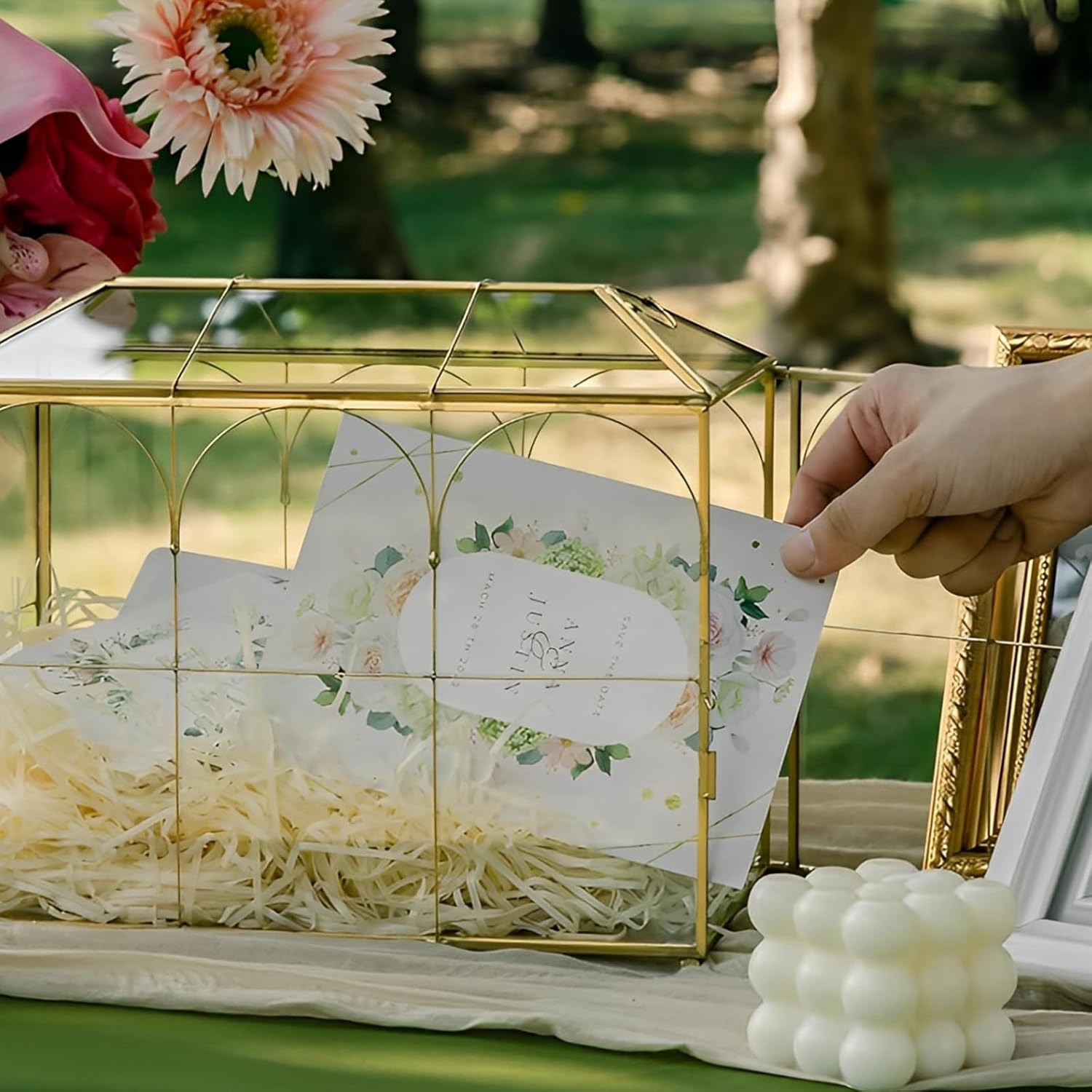 | Included Components | 1 PC Large Gold and Glass Card Box |