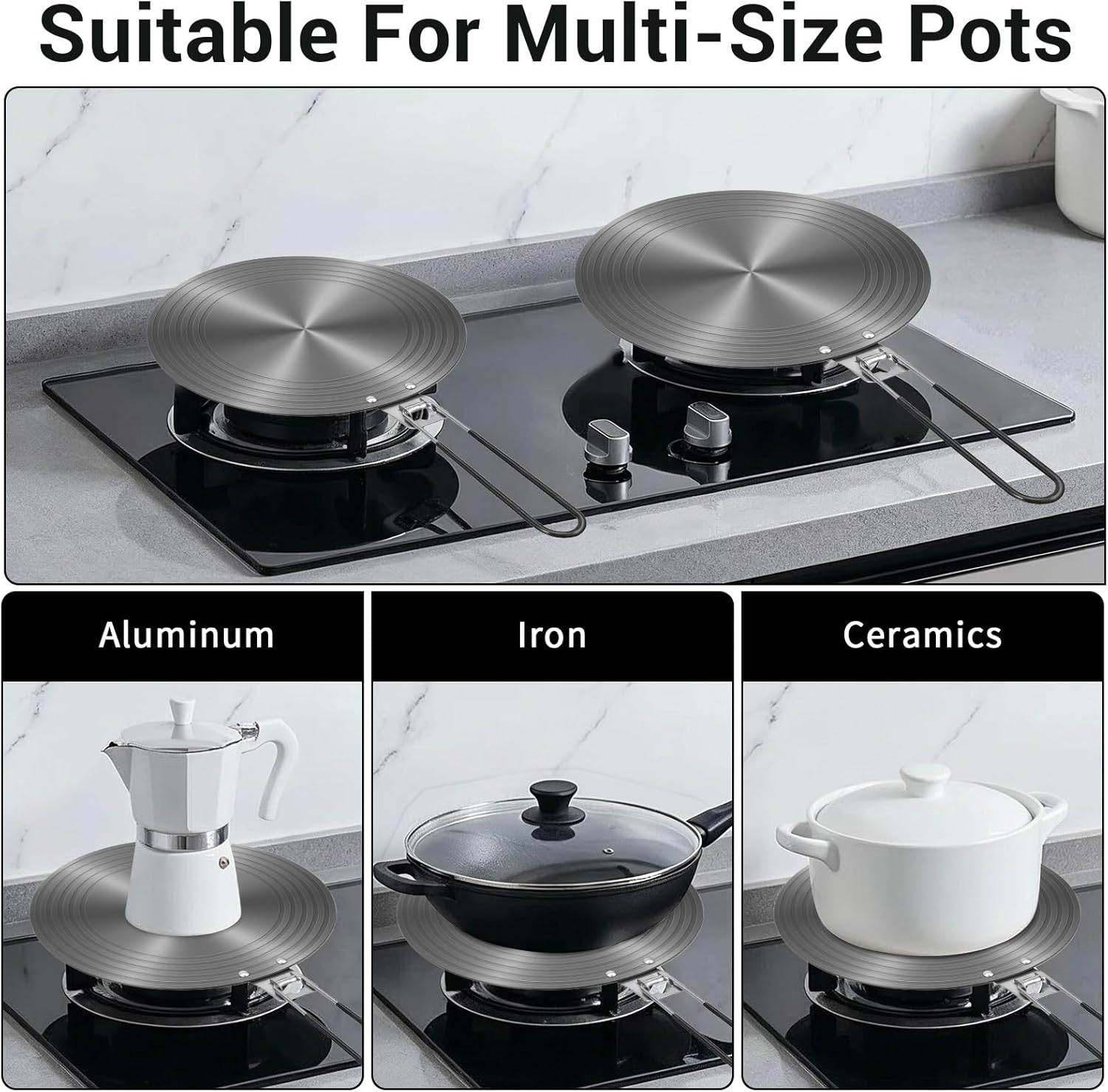 Upgrade your kitchen with our 2-Pack Heat Diffuser for Gas Stove and electric models. This Gas Stove Diffuser Plate set (9.5" & 11") ensures even heat distribution as a versatile Simmer Plate for Gas Stove. Made of 3mm thick aluminum, this Heat Diffuser Plate acts as a protective Stove Top Heat Diffuser and rapid defrosting tray. The foldable handle ensures safe handling. This essential Stove Heat Diffuser prevents burnt food and cookware damage, perfect for slow cooking and simmering.SpecificationMaterial: AluminumColor: GraySize: 9.5"/24 cm and 11"/28 cmPackage includes:2 pcs heat diffuser for gas stoveNOTES:Due to manual measurement, there may be slight errors in size.The color may exist a slight difference due to different screen displays.If you have any questions about our products, please contact us. We will be happy to serve you.