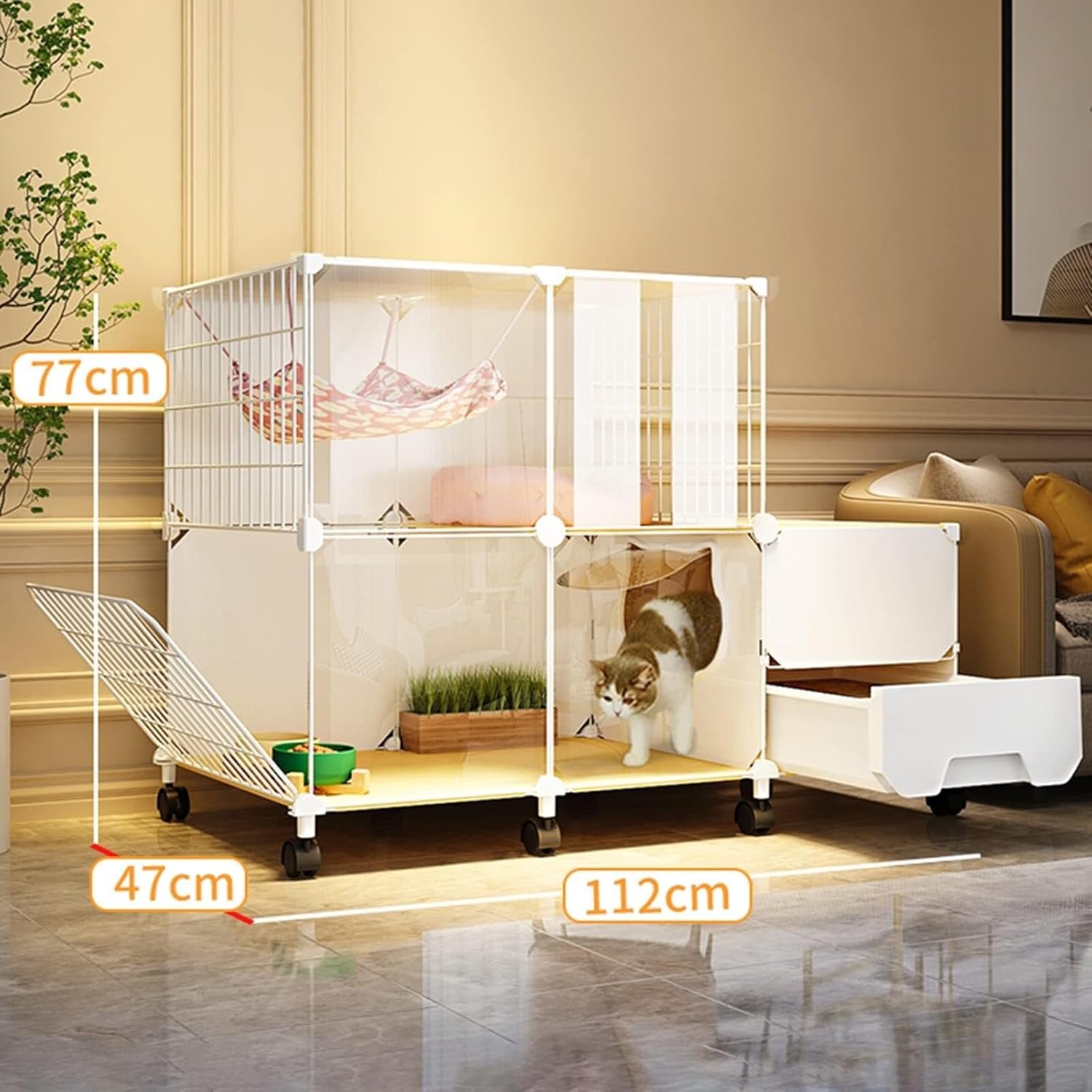 Give your kittens or small pets a secure and spacious environment with this 2-tier indoor cat cage. Crafted from sturdy metal wire with a rust-resistant white finish, this DIY cat playpen offers ample room for exercise, play, and rest. The carefully designed wire spacing ensures safety by preventing your pets from getting stuck while maintaining excellent airflow.Featuring two convenient doors, the cage allows easy access for your pets and simplifies cleaning tasks. Smooth-rolling casters with locking mechanisms enable you to effortlessly move the cage around your home while keeping it stable when stationary. This versatile cage can be customized to different shapes and sizes thanks to its easy DIY assembly system with connectors and included tools. Product name: DIY cat cage Colours: WhiteMaterial: metal, ABS plastic Package includes: Cat cages, installation tools (Other accessories not included)Note: 1.Part of the paint will fall off during transportation, but it will not affect the use, please purchase with caution!3. lf you have any questions, you can contact us by email, and we will reply within 12 hours.