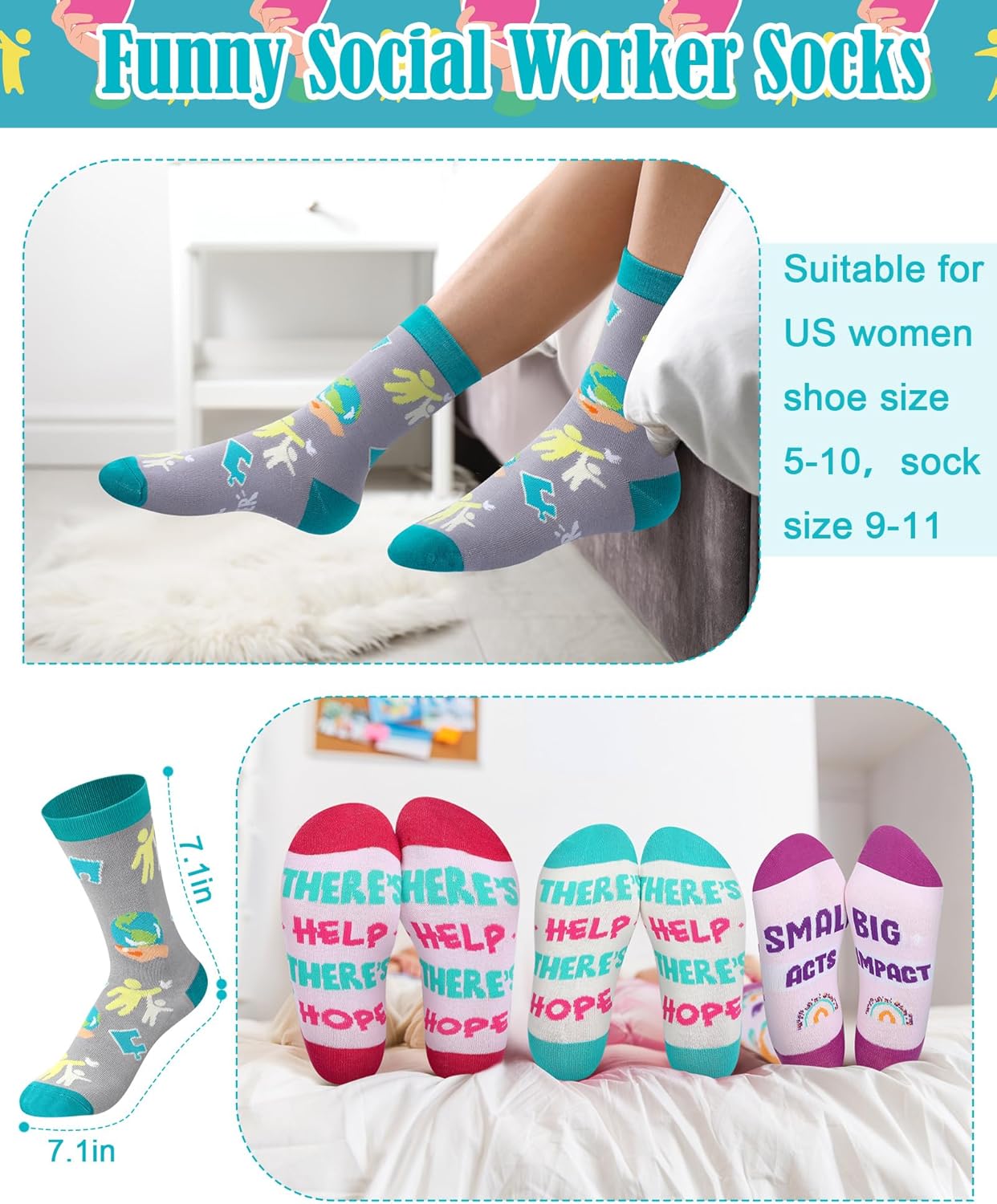 Features: These worker socks could be the nice gifts for office social workers, and they also make nice volunteer appreciation gifts. They serve as a reminder of the valuable role social workers play in society. Each pair of socks is a warm token of gratitude that shows how much their commitment and dedication means to you, making them a nice gift for social workers, volunteers, and as a motivational reminder for students studying social work. Specifications: Material: polyester and cotton Color: as shown in the picture Size: as shown in the picture Package includes: 24 x Worker socks Notes: Manual measurement, please allow slight errors on size. The color may exist a slight difference due to different screen displays.