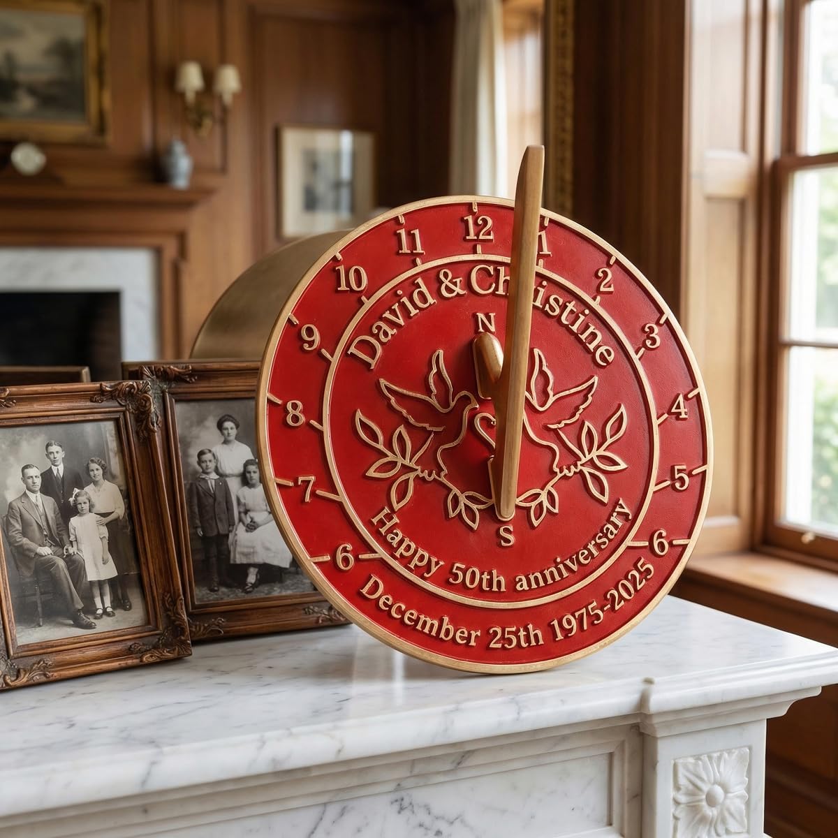 This personalized sundial is a permanent outdoor keepsake crafted to honor forty years of marriage. Custom engraved across four distinct zones with names, dates, a meaningful quote, and a center logo or design of your choice. Available in aluminum or solid brass, in four sizes and five finish colors — including a deep red finish that evokes the iconic ruby gemstone of the 40th anniversary milestone.Four Personalization Zones: Top text, bottom text, outer lower rim text, and a center logo or custom designTwo Material Options: Lightweight weatherproof aluminum, or warm solid brass that develops a rich patina over timeFive Finish Colors: Black, White, Green, Blue, Red — the Red finish is especially fitting for a ruby anniversaryFour Size Options: 5.9 in (15 cm), 7.9 in (20 cm), 11.81 in (30 cm), 15.75 in (40 cm)Built for Outdoor Display: Weatherproof construction suitable for garden, patio, lawn, deck, and porch year-roundPersonalization Zones:Top Position: Custom text line — e.g. "Elizabeth & Robert" or "Est. 1984"Bottom Position: Custom text line — e.g. "40 Years of Love" or your anniversary dateOuter Lower Rim: Custom text line — a quote, vow line, or family nameCenter: Custom logo or design — initials monogram, family crest, or personal artworkSize Guide:5.9 in / 15 cm: Tabletop, small patio corner, or indoor shelf display7.9 in / 20 cm: Garden bed border, deck accent, or porch display11.81 in / 30 cm: Lawn centerpiece or backyard focal point15.75 in / 40 cm: Grand garden statement piece or sweeping yard installationIdeal For: 40th wedding anniversary, ruby jubilee celebration, vow renewal, gift for parents or in-laws, husband or wife, and luxury garden decor lovers.Please Note: This is a made-to-order custom product. Submit your personalization details — text lines and center design — after checkout. For best results, provide high-resolution artwork for the center logo or design zone.