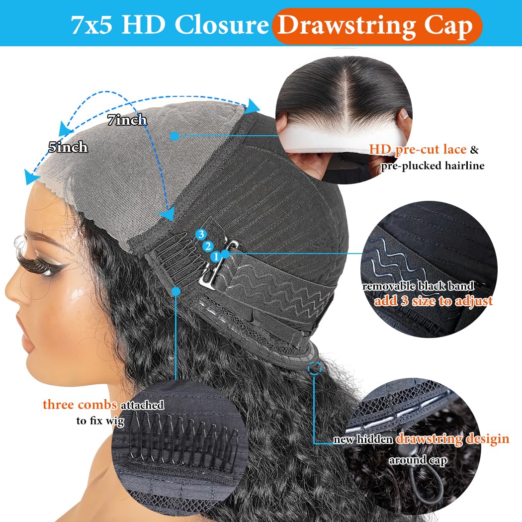 | Other Special Features of the Product | 100% human hair wig for women no shedding no tangle, 210% density full wig with full end, 7x5 hd lace closure wigs human hair with lace tape lay flat, drawsting cap for deep wave lace front wigs human hair no slip down, glueless wigs human hair pre plucked pre cut ready to go |