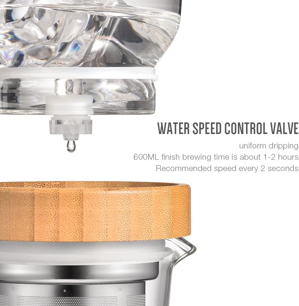 Product type: Dutch coffee machineMaterial: heat-resistant glass / 18/8 stainless steel / woodCapacity: 800MLDimensions: 36 x 12 x 12 cmBox contents:1 x Cold brew coffee machineThe difference between the coffee machine and the normal coffee machine.Compared to the traditional method of fully immersing, superficial cooled coffee slowly extracts coffee from coffee beans with cold water soaked in ice for 4 to 6 hours, so that the coffee powder is soaked at low temperature. Slow extracting, more release aroma.Cold brew coffee does not require additional filtering. This guarantees a much lower acid content than normal coffee and the taste becomes smoother.The basics of the ice drop.How much coffeeFor this coffee machine includes a general guide 50 g coffee set for 800 ml.Sanding size?Medium or finely dependent is recommended.Type of ice?✓ Ice may be made with filtered water is recommended. Fill 1/3 of filtered cold water the ice to start brewing.Drip rate?✓ A drop rate of 5 drops per 10 seconds is recommended.How to use:1. Take off the upper chamber.2、Put coffee powder or tea into the filter cup.3、Place the top chamber the carafe, put ice cubes or water into the top pot.4、Adjust the tap to the desired water drop quantity.5. Wait until the entire brewing process is complete.Note:Please do not use microwave or washing machine.Multi-Purpose- Add touch to your kitchen with this design. More than a coffee maker. Many uses including frothing milk for lattes, hot chocolate and brewing tea. Even use it to warm honey, melt butter and coconut oil or make sauces!