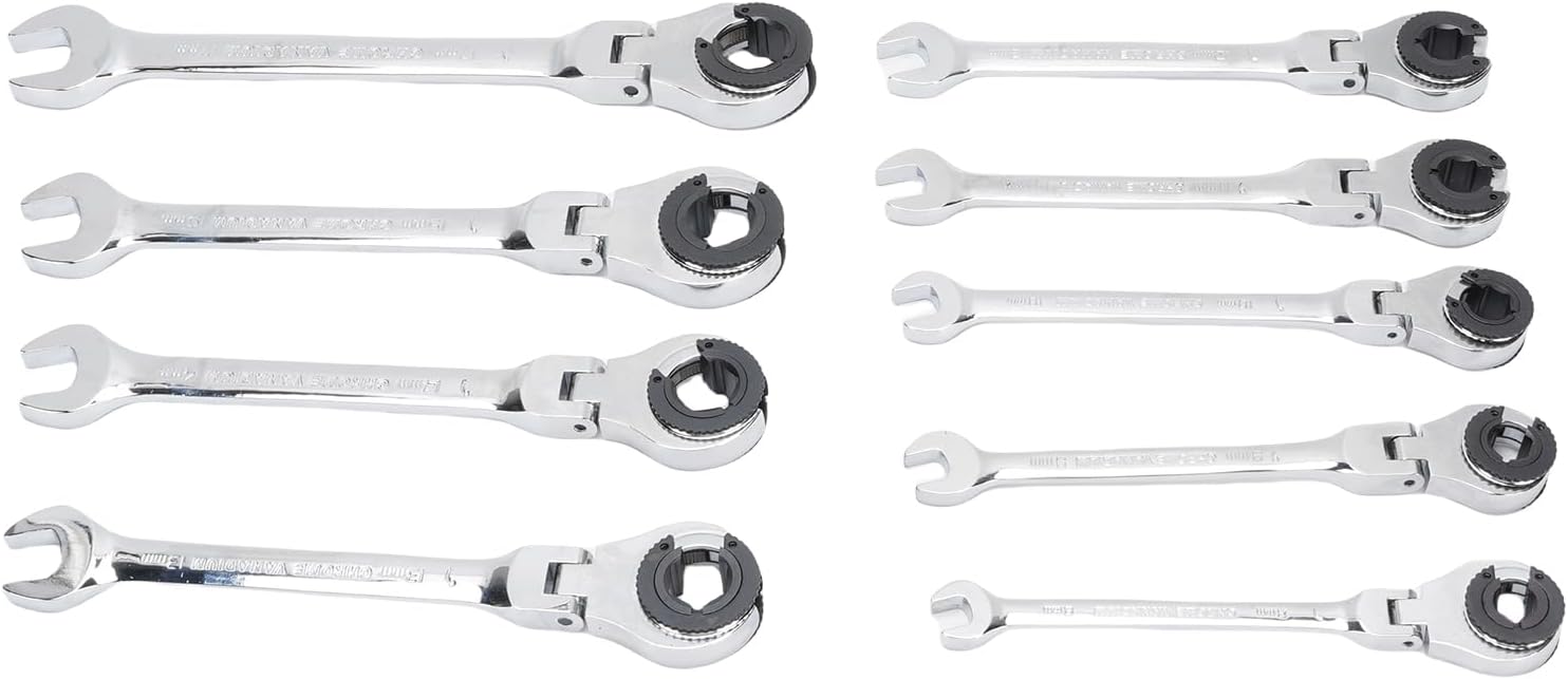 [Versatile Tool Set]Includes 9 flexible ratcheting wrenches from 8mm to 17mm, perfect for automotive and mechanical tasks. [Efficient Design]72-tooth ratchet mechanism engages with a 5-degree swing arc, minimizing repositioning time in tight spaces. [Dual-End Functionality]Open-end wrench on one side and adjustable ratcheting tip on the other, adapts easily to various tasks. [Professional Performance]CR V steel construction excels in tightening nuts for air conditioning and brake lines without damaging components. [Convenient Access] tight spots effortlessly, making it ideal for fuel lines, brake systems, and air conditioning units. Item Type: Ratcheting Wrench Combination Material: Cr V steel Specification: 8, 9, 10, 11, 12, 13, 14, 15, 17mm Application: For fuel, brake, or air conditioning pipelines nuts 9 x Wrenches 1 x Storage Box