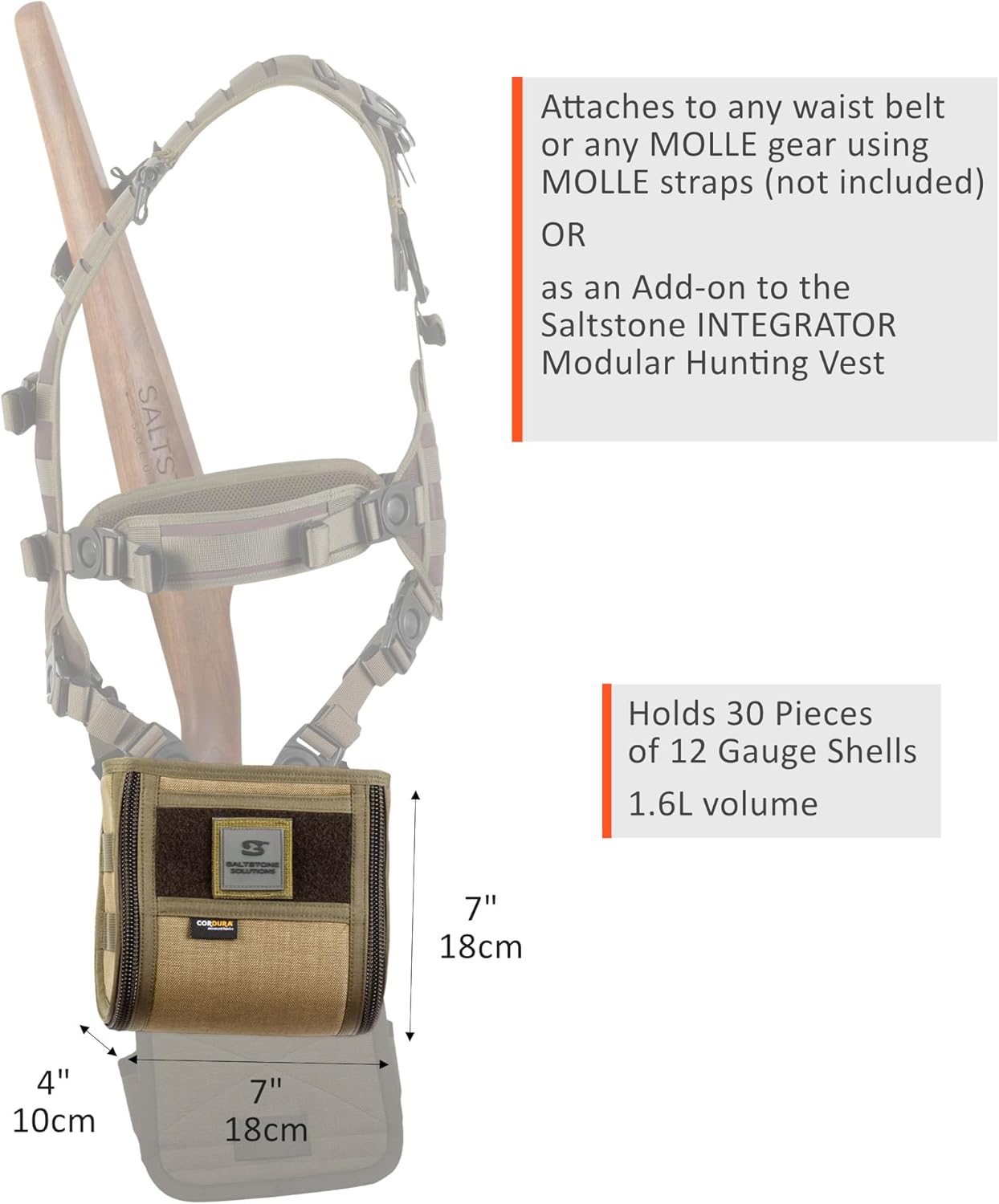 "The SALTSTONE Ammo Pouch is a compact, field-ready ammunition carrier designed to integrate perfectly with your SALTSTONE Integrator. Despite its lightweight profile, it offers 1.6 liters of secure storage — enough to carry 30 pieces of 12 gauge shells. What sets it apart is the innovative double rubber band entry system. Instead of relying on zippers or flaps, this smart design keeps your ammo accessible when needed — but automatically seals shut when the pouch is flipped or jostled. The weight of the ammo presses the opening closed, preventing accidental spills even during fast movements or when crawling through terrain. Built from rugged Cordura material, the pouch resists water, dirt, and wear. It attaches easily to either side of the Integrator vest and is available in Orange, Coyote, Green, and Brown."
