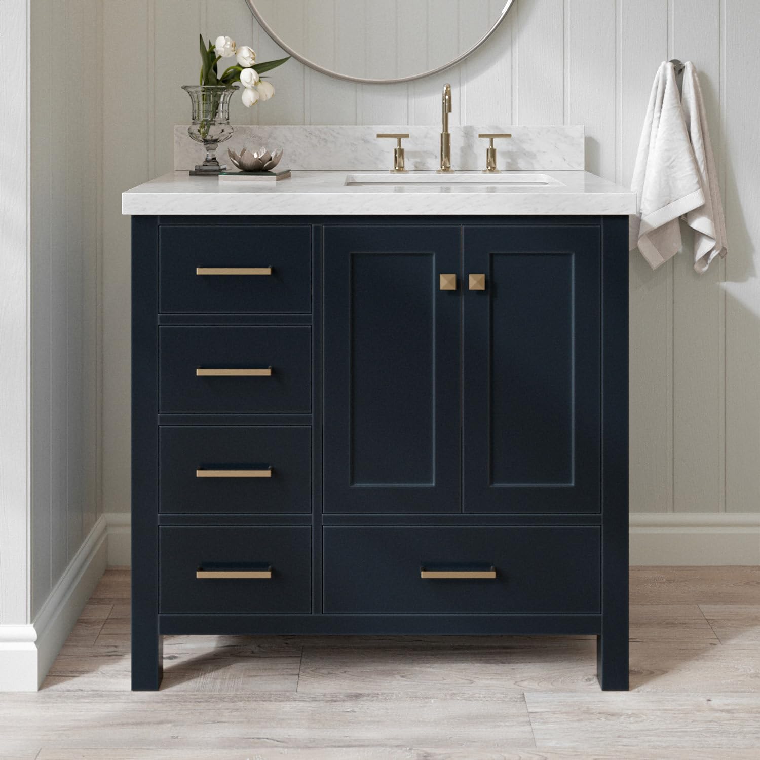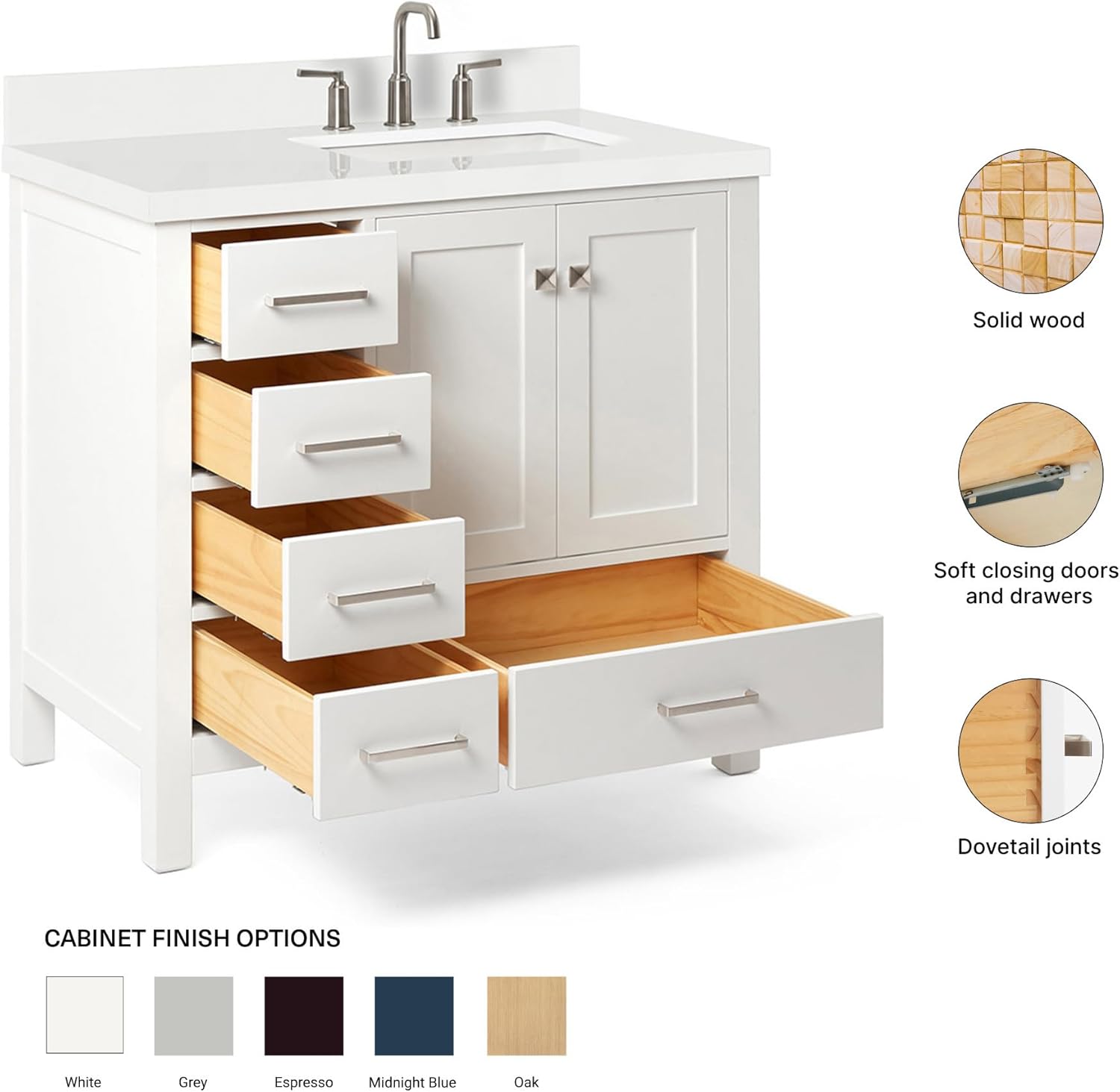 | Included Components | solid wood base cabinet, polished predrilled double-sealed countertop, rectangular porcelain undermount sink, 4-inch backsplash, brushed nickel hardware, adjustable soft-close drawer glides, hinges |