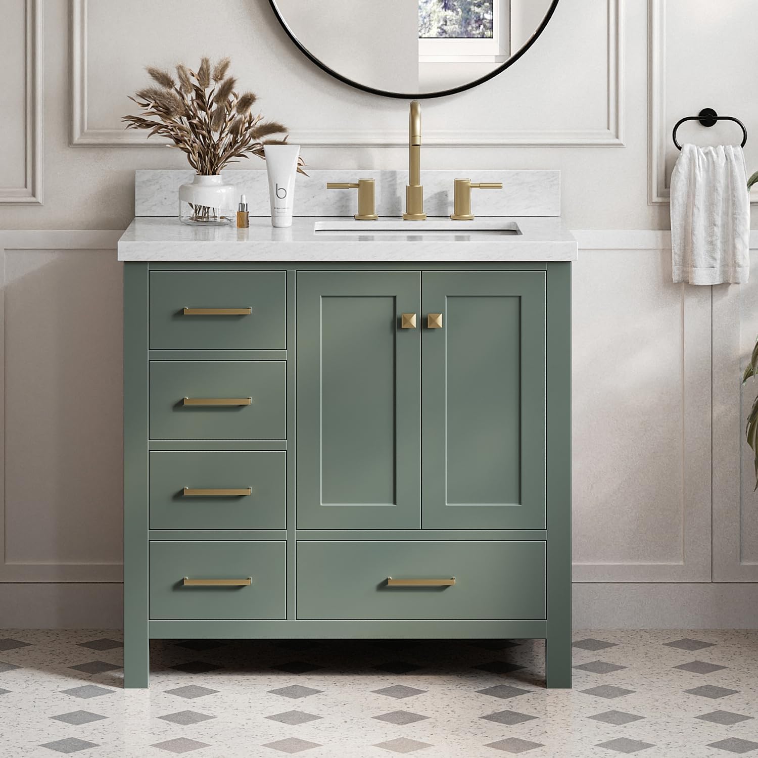 | Additional Features | 3-Year Limited Warranty, 1.5-Inch Mitered Edge Stain and Scratch Resistant Pure White Quartz Countertop, Solid Hardwood Bathroom Vanity Construction, Premium Sherwin Williams Painting Process, Soft Closing Doors & Drawer, Solid Wood Dovetail Drawer Box, No MDF, Staples or Dowels, Adjustable Hinges, Predrilled Countertop For 3-Hole Faucet-8" Inch Wide Spread. Faucets, drain, lights, and mirror are not included, allowing you to fully customize to your style and preference. |