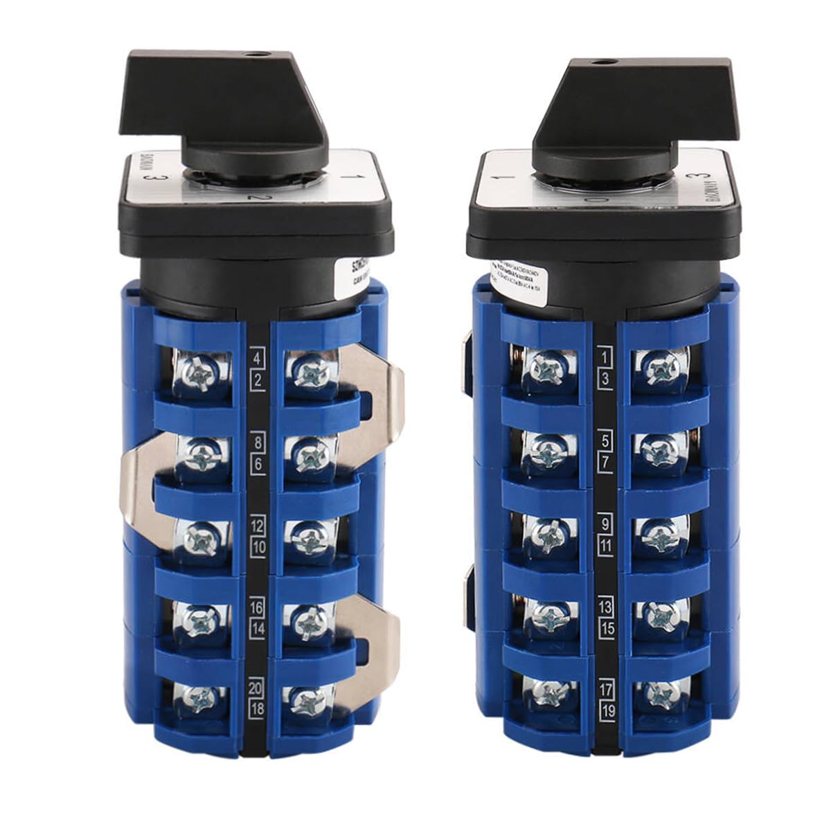 Feature: 4 positions (0-1-2-3) ,5 poles, 18 screw terminals, with locking action type. It's uitable for the thickness between 1mm to 5mm of the mounting board. Rotary Changeover Switch with Silver Alloy Contacts and Flame Retardant PC Housing material.Changeover switch mainly suitable for electrical wiring in the power switch and Squirrel cage type asynchronous motor start-up, reversing, speed switches, also can make the conversion of the control circuit.