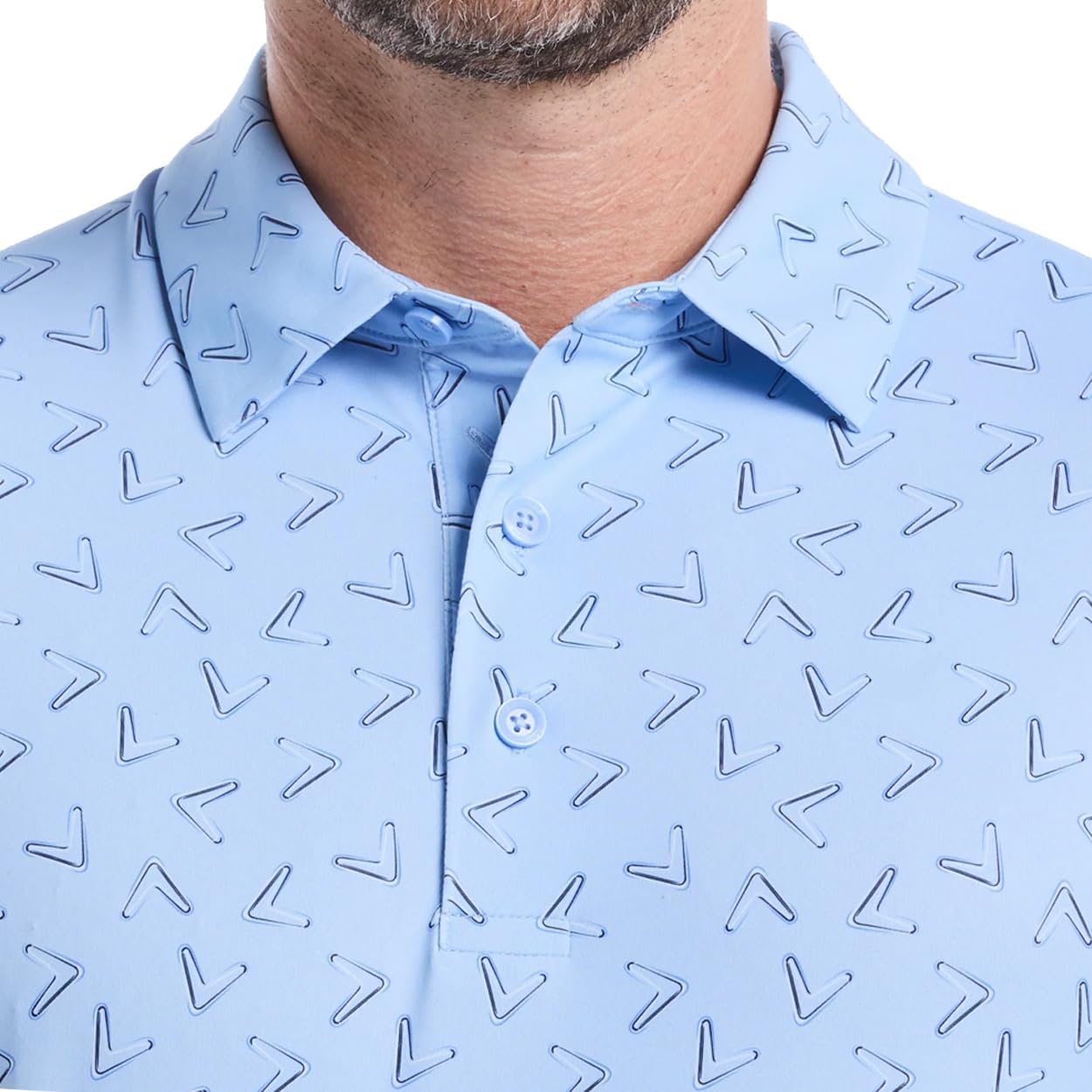 Callaway Golf Men’s All Over Chevron Printed Polo Shirt — Performance Golf Top Classic Callaway performance and modern style in one — the Chevron Printed Polo delivers breathable comfort and a sharp, chevron-print look that performs on the course and looks great off it. Style: Short-sleeve polo with chevron print. Fabric: Lightweight performance blend (polyester/spandex) — soft, smooth handfeel. Performance: Moisture-wicking and quick-dry technology to keep you cool and dry. Fit: Athletic/regular fit with stretch for full range of motion while swinging. Sun Protection: Built-in UPF (sun protection) for long days on the course. Design Details: Three-button placket, contrast collar/trim (varies by color), subtle Callaway branding. Ideal For: Golf, practice, casual wear, travel