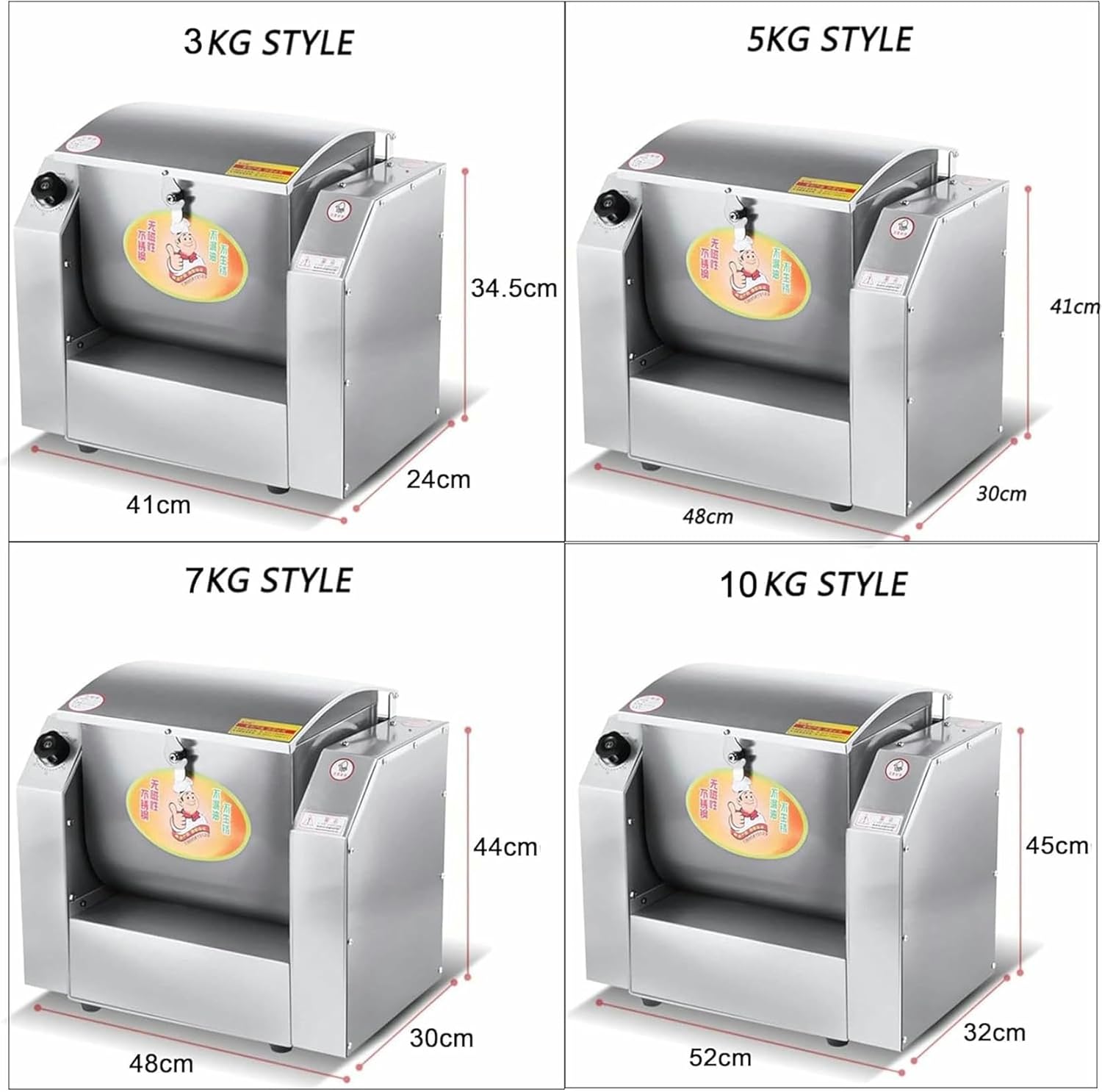 Specification:3 kilosMaterial: Stainless steel.Power: 1.1 KWProduction efficiency: 30kg/HAdd flour at once: 1.5-3 kgPasta bin capacity: 10LDuration: up to 30 minutesBody size: 41x24x34.5cmNoodle bucket size: 26*20*21cmWeight: 18 kg5kg-7kg-10kgMaterial: Stainless steel.Power: 1.5 KWProduction efficiency: 50kg/H/75kg/H/100kg/HAdd flour at a time: 2-5 kg/5-7 kg/7-10 kgPasta Bucket Capacity: 18L/20L/30LDuration: up to 30 minutesBody size: 48*30*41cm/48*30*44cm/55*33*47cmNoodle bucket size: 30*23*27cm/30*23.5*30cm/34*25.5*32cmWeight: 25kg/25kg/31kgPacking list:1 x dough mixer.1 x user manual in English