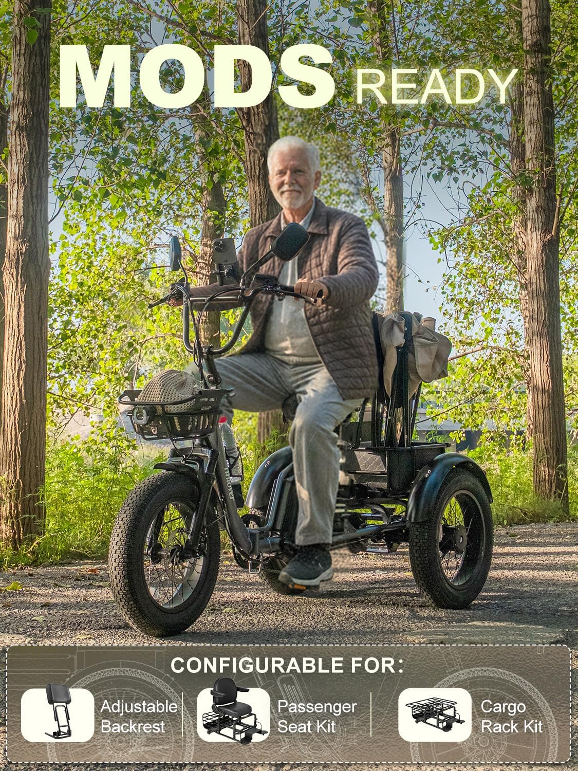 | Included Components | ● 1× Tiniover Creek Electric Tricycle ● 1× 48V 15AH Removable Battery ● 1× Fast-Charging Charger ● 2× Basket (Front & Rear) ● 3× Fender (1× Front & 2× Rear) ● 2× Pedal ● 2× Rear Hubcap ● 2× Axle Protective Cover ● 1× Tool Kit ● 1× Oversized Allen Wrench ● 1× Spare Paint ● 1× User Manual ● 1× Quick Installation Guide ------ The rear basket is standard and is packed in the trike box. ------ The modular conversion kit, passenger seat, and cargo rack are each packaged separately (Passenger seat kit = modular conversion kit + passenger seat) (Cargo rack kit = modular conversion kit + cargo rack). |