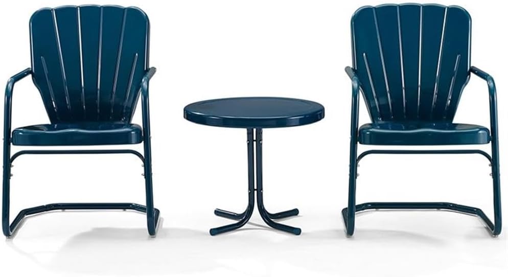 Sit back and relax in classic comfort and style with the retro Ridgeland metal outdoor furniture collection from Crosley Furniture. Durable steel construction with bright powder-coat finish makes this chair ideal for all weather conditions. Available in many colors to add a pop to the patio. This three piece set features two of Ridgeland chairs and one metal side table.