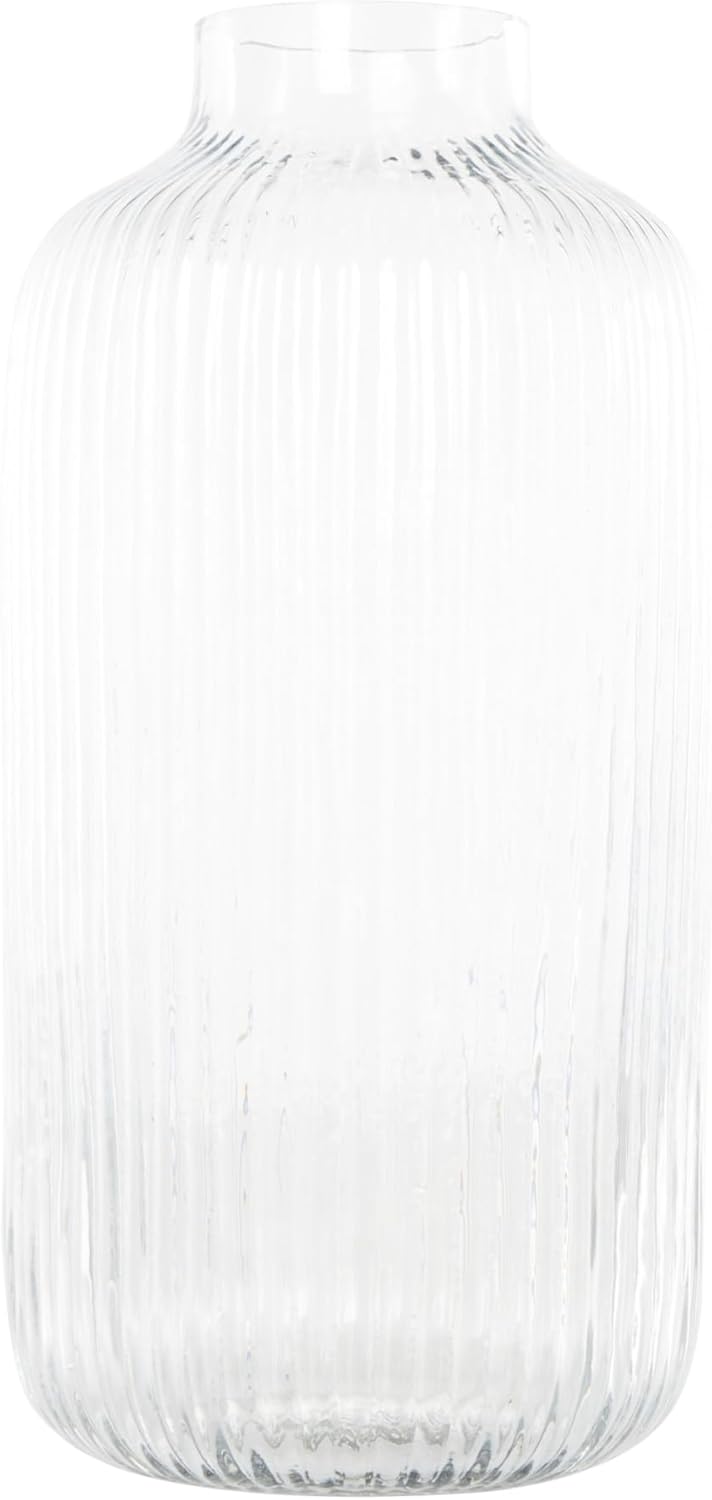 Each element of the contemporary vase for home decor is meticulously crafted from durable glass to ensure longevity. Polished clear vase for dried flowers has a sleek, round shape with a linear ribbed pattern that enhances its modern appeal. Wipe clean with a dry cloth. This clear centerpiece vase is perfect for enhancing the beauty of your living room coffee table or dining table, with fresh floral or greenery. Designed with felt or rubber stoppers at the base that prevent scratching furniture and table tops, as well as sliding around. This item ships in 1 carton. Glass vase makes a great gift for any occasion. Suitable for indoor use only. This item ships fully assembled in one piece. Made in India. This is a single clear colored vase. Contemporary style. Vase has a 2.50 in mouth opening.