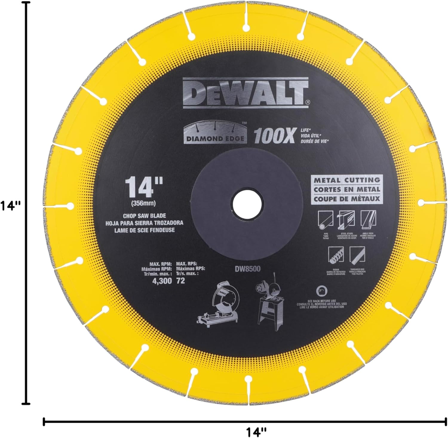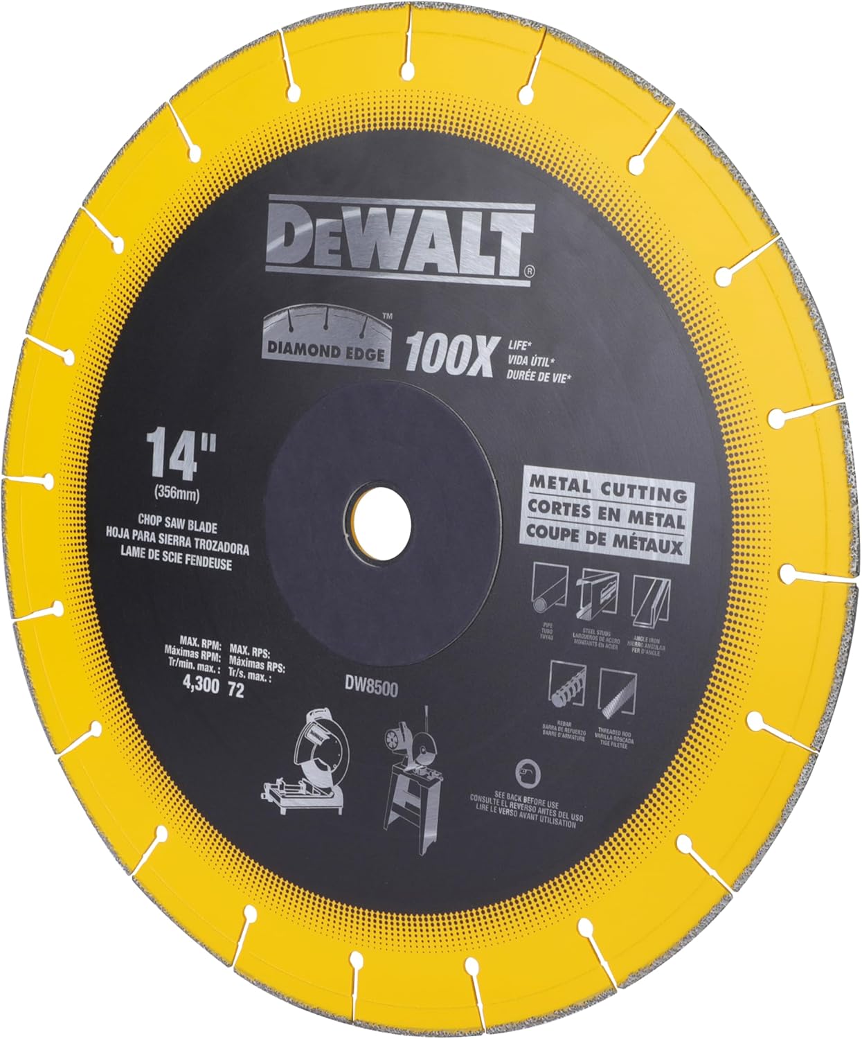 Product Description DEWALT DW8500 14" X 7/64" X 1" DIAMOND CHOP SAW BLADE From the Manufacturer The DEWALT DW8005 Diamond Edge chop saw blade reduces product costs for the end user and lasts 100 times longer compared to conventional DEWALT abrasive blades, DW8001 and DW8003 by utilizing technology that allows diamond to be used to cut metal without sacrificing cutting performance. This blade is ideal for tradesmen tasked with cutting pipe, steel studs, angle iron, rebar and threaded rod using a chop saw. The Diamond Edge blade makes use of advanced brazing technology and premium diamond grit for increased speed and longer life compared to standard DEWALT blades. While the brazing technology is what enables the blades to cut metal with the speed of a conventional abrasive wheel, the premium diamond grit lasts more than 100 times the life of standard DEWALT abrasive blades in metal. A steel blade core provides the constant cutting depth, capacity and stability of a solid core, and the exposed diamond matrix allows the blades to cut concrete, plastic, fiberglass, rubber, non-ferrous metals, stainless and ferrous metals without loading for flexibility on the jobsite.