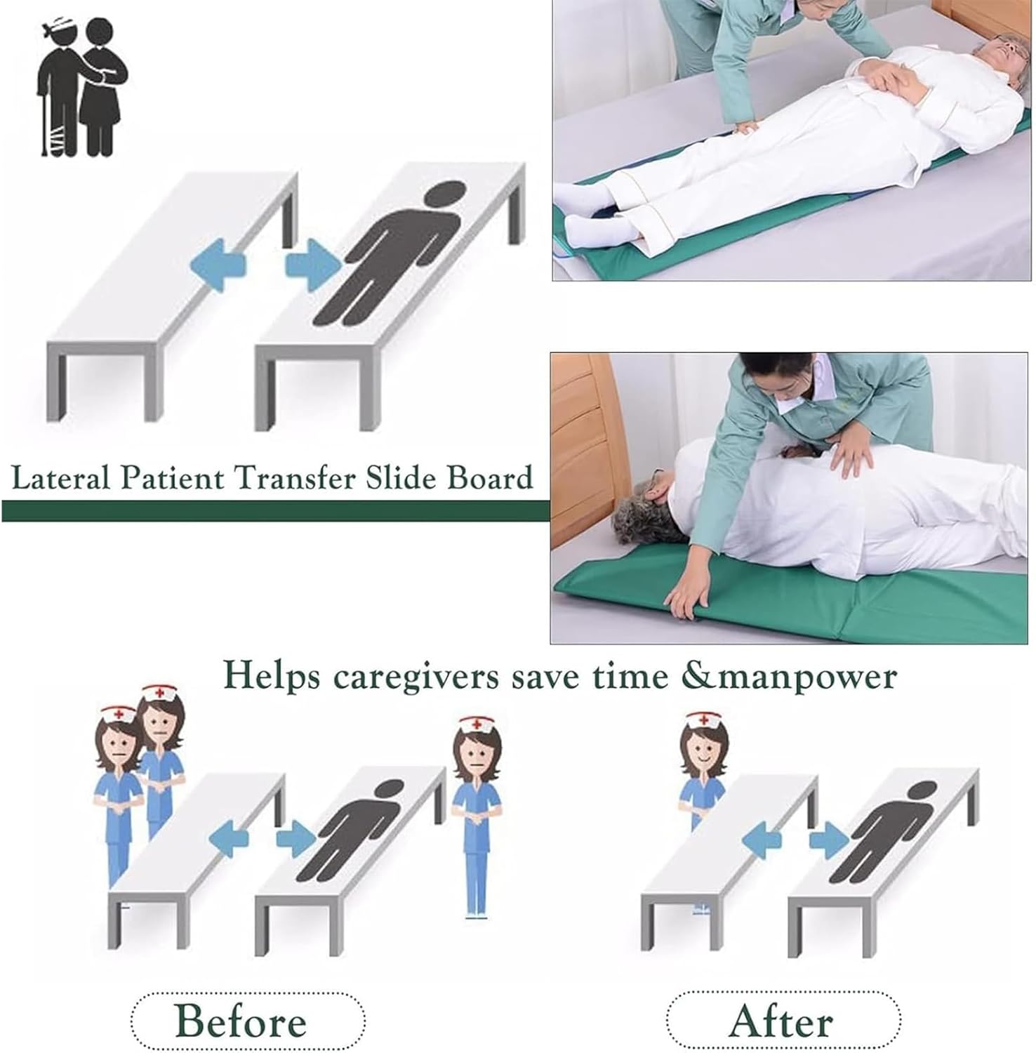 The safe, comfortable transport of patient is a key component of quality medical care. Especially for those suffering from obesity,paralysis,or other physically limiting conditions, loss of mobility can make it difficult to convey them to check-ups and procedures.Our medical patient transfer board is a perfect solution to transfer patient from or tables to stretchers or from stretchers to hospital beds.The comfortable soft foam core- with no hard metal rollers- is easy on patients. It is radiolucent and can be left under the patient during imaging procedures.The Transfer cover rotates around the transfer board for low friction between transfer surfaces.No special training technique requirements.Straps make you can carry this lightweight device on your shoulder and Patient Weight Capacity: 500lbs.Weight: 6.6 lbsHow To Use1) Ensure the patient's bed and other bed placed side by side at same height, with the bed brakes on.2) The rolling transfer board is then positioned next to the patient.3) The carer nearest the patient log rolls the patient to side lying. Put the transfer board extend to the side of patient, then carer can make patient lying flat to original position, make sure transfer board under the body of patient.4) Push the patient's body gently, patient will tranfer to other bed right place.5) The carer go to the other side of the bed, and log rolls the patient to side lying. and take off the transfer board.6) Finally, carer make patient's body lying flat.