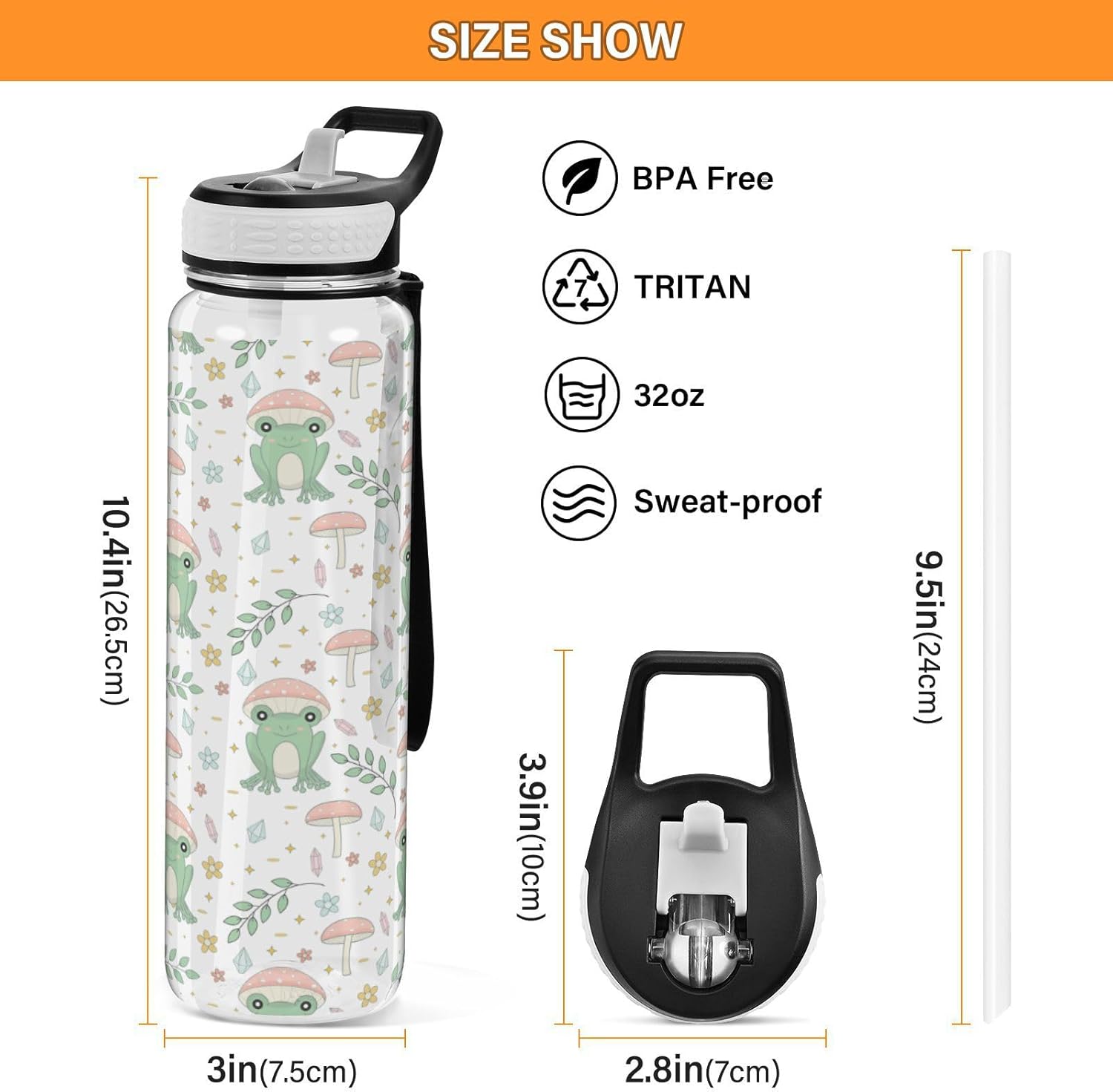 Fustylead Clear Sport Water Bottle Material: 100% BPA Free Tritan Volume: 32oz / 1000ml Bottle Diameter: 3in / 7.5cm Bottle Height: 11.4in / 26.5cm Wide Mouth Design With the wide mouth design, you may enjoy the pleasure of drinking water in great gulps. Food-Grade Silicone Straw The water bottle is equipped with a soft silicone straw. When turning on or off, the nozzle should not be aimed at the human body to avoid burns. Easy to Clean All the accessories of this sports water bottle can be removed individually, which is very easy to clean. When cleaning the straw it is recommended to use a thin brush. Translucent Pattern The translucent bottle can see your water consumption. The transparent Frog Mushrooms pattern gives a pop of color to your sports water bottle. Warming Tip 1.Please do not overfill the water to avoid spilling water when the lid is closed. 2.Do not overfill the cup when adding boiled water to prevent overflow burns. 3.Use the straw drinking water, water temperature please below 104℉, to avoid scalding. Usage Instructions 1.Do not add dry ice, carbonated drinks, or other liquids that can easily generate high pressure in the bottle to avoid leakage. 2.Try not to use this water bottle for all kinds of alkaline, acidic liquids, such as soy sauce, soup, etc. To prevent corrosion of the cup body. 3.Please wash the bottle as soon as possible after filling it with milk and drinks for the next use. 4.It is strictly forbidden to place the product in the open fire, microwave oven, induction cooker, dishwasher heating! 5.Before using the water bottle for the first time, please wash the interior and outside with neutral detergent. Avoid using alkaline bleach or other chemical reagents.