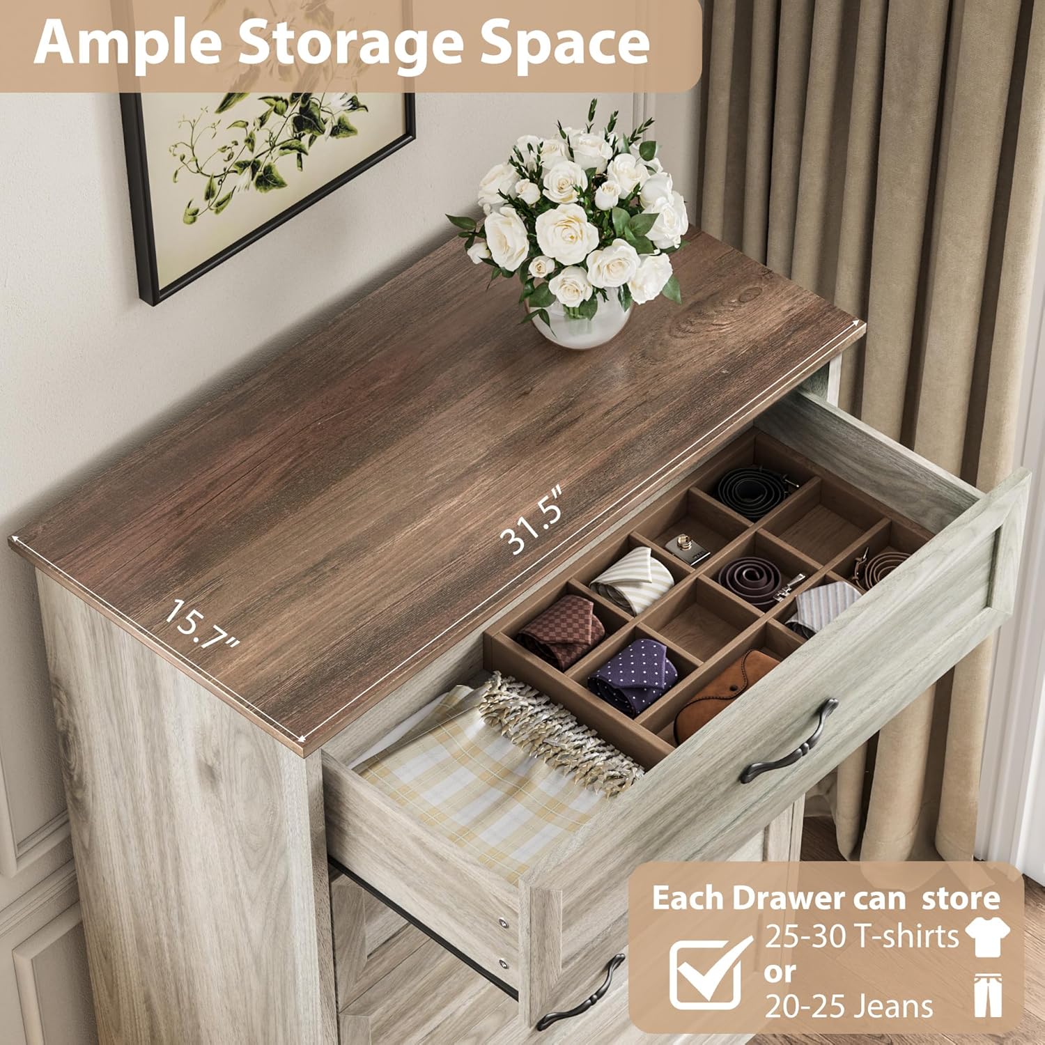 Richly Rustic AestheticThis rustic farmhouse dresser boasts a crisp, quaint profile with striking weathered oak grain, distressed finish and thick plank styling for rustic warmth. Antiqued handles nod to country farmhouse charm, creating a chic look that seamlessly complements any furniture and decor.Satisfactory Storage CapacityMeasuring 31.5"W × 15.7"D × 43.9"H, the dresser features 5 large drawers (5.8 inches deep) to classify and store socks, clothing, linens and more. Its spacious tabletop also serves as a stylish display for framed photos and artistic accents.Stability and DurabilityThe floor-standing and curved base design enhances stability, with the top supporting up to 150lbs and each drawer up to 33lbs. The high-quality finish ensures easy cleaning and resistance to daily wear, extending the dresser’s lifespan.Multifunctional UseWith a versatile finish, this classic farmhouse-style dresser adapts to multiple rooms—use it as a bedroom storage cabinet, entryway organizer for essentials, or living room TV console for odds and ends.Easy AssemblyDesigned for hassle-free installation, the dresser includes detailed instructions, numbered parts and pre-drilled holes for quick assembly. We offer 24-hour email response to address any pre or post-purchase questions.