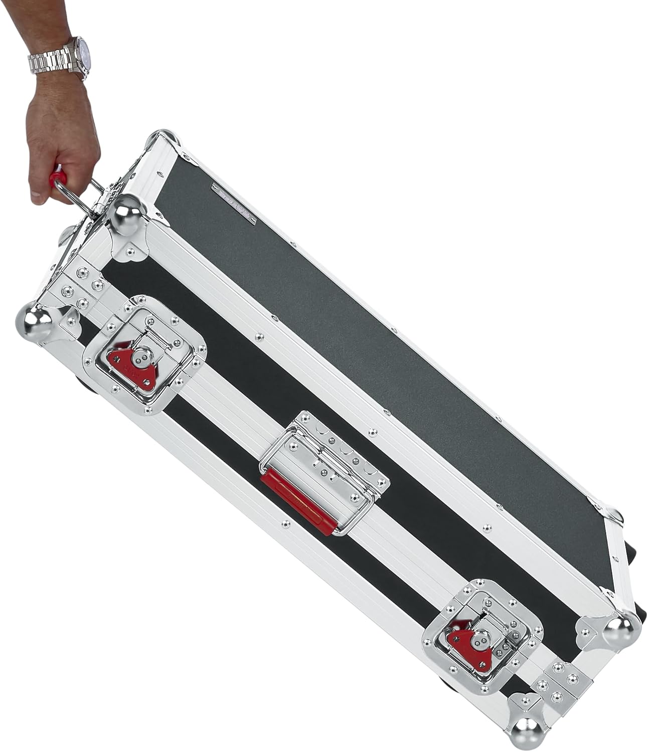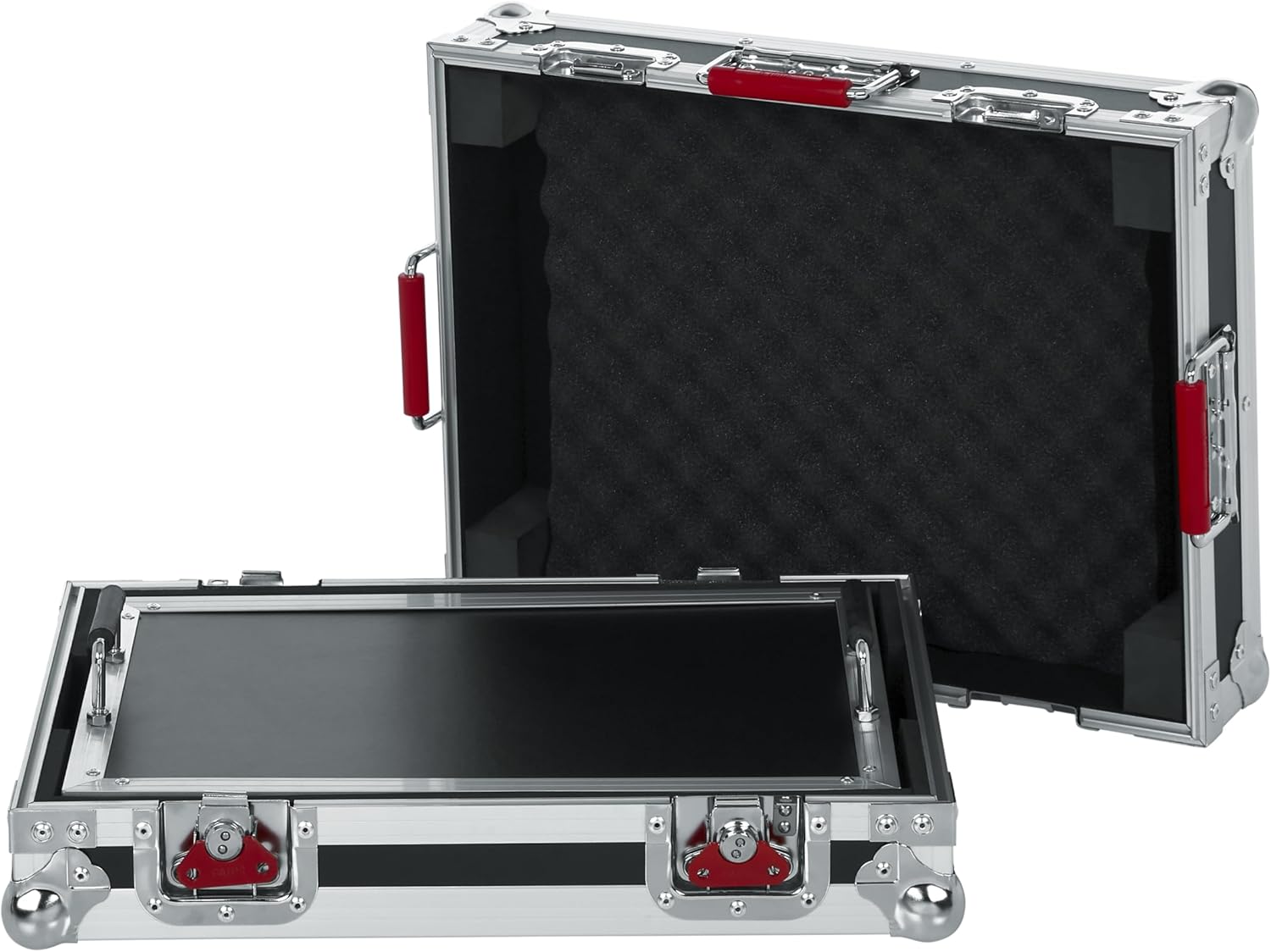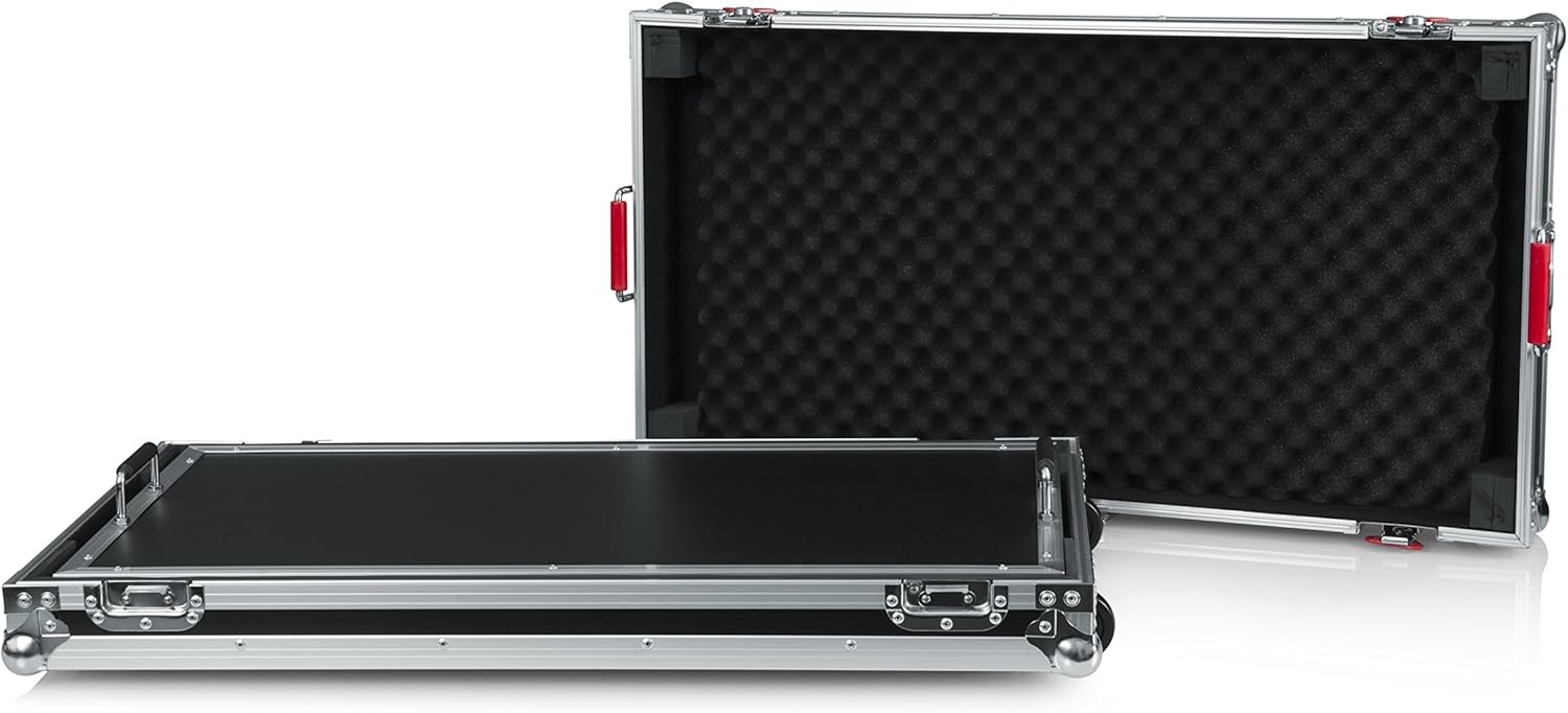 The Gator Cases tour series guitar effects pedal board provides serious protection for guitar effects pedals. The G-TOUR series guitar pedal board also features an extra large removable pedal board with a usable surface that measures 32” x 17”. the interior protection includes thick pro grade shock absorbing EVA foam. The pedals fasten to the removable pedal board with the provided 3M dual lock. Plenty of storage space for cables and accessories exist under in the lower portion of the case. The exterior of this amazing guitar pedal board boasts a thick plywood frame and aluminum valance for ultimate protection. The pedal board case also features Gator Cases signature heavy duty spring loaded red rubber grip handles and robust, recessed butterfly latches.