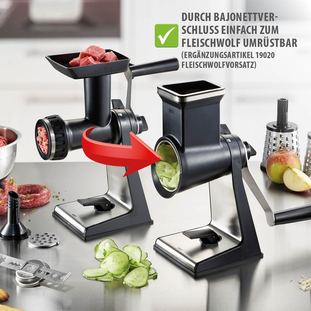 Coarse, fine or sliced: the multifunctional drum grater with its extra sharp LASER CUT drums processes fruit, vegetables, chestnuts, cheese, chocolate, nuts, etc. in no time at all.