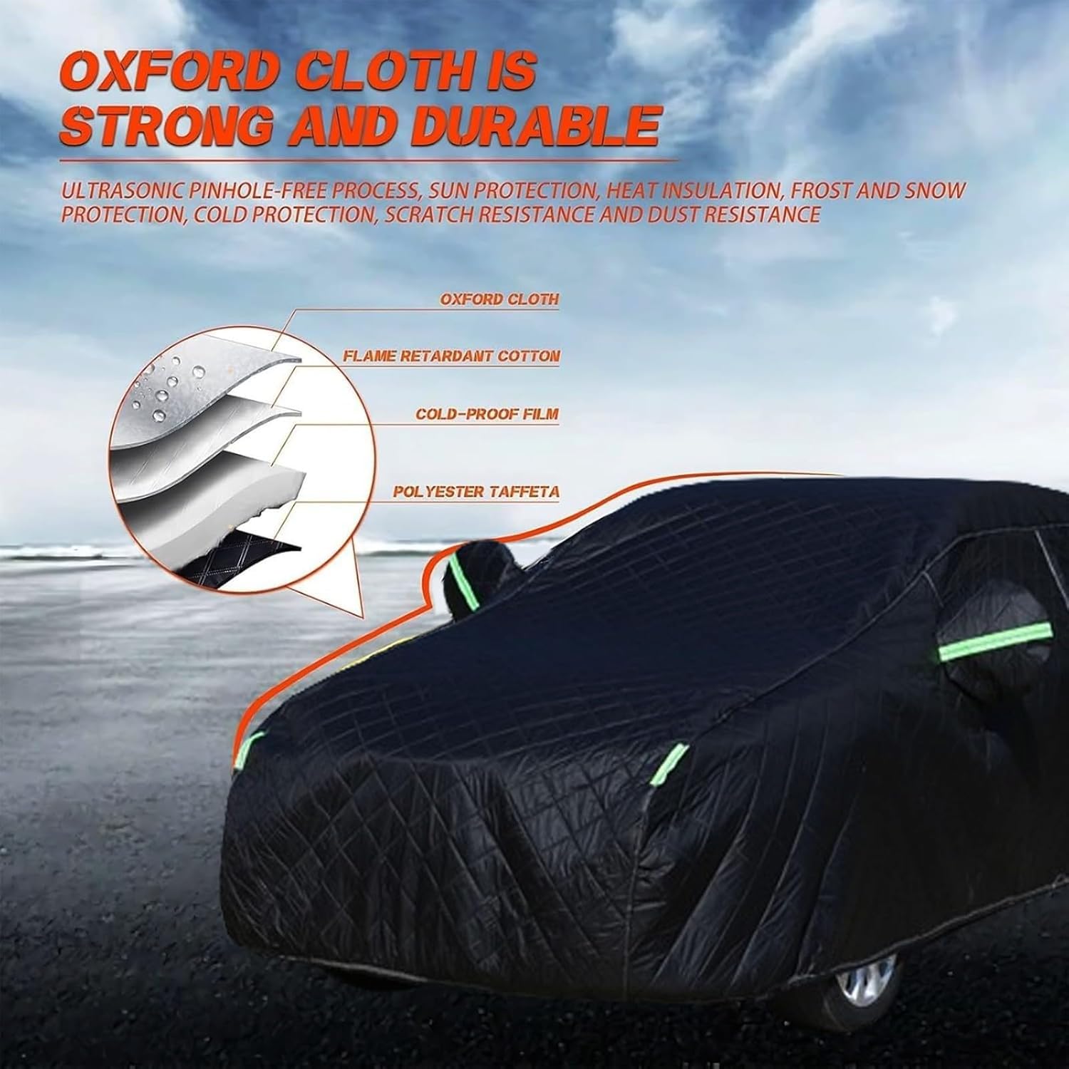 Product parameters:Product name: Hail Protector Car Cover Compatible with Dodge ChallengerBrand: YXUOProduct weight: 5.4KGMaterial:Outer layer - Thicken Oxford cloth (Hail-Proof,Sunscreen, Waterproof, )Middle layer - thickened flame retardant cotton (to maintain the temperature inside the car)Liner - Soft polyester taffeta lining (to protect the car's paint)Color: Silver/BlackFeatures:1. Sun protection; waterproof; anti-hail weather and snow2. Flame retardant cotton, thick and warm3. Nighttime reflective warning to improve vehicle visibility4.360 degree windproof5. Maintain the temperature inside the car in winter and start the car quickly and comfortably6. Reinforced elastic band, good firmness, can not be blown away by windInstall:1. The bottom elastic band is tightened and fixed2. Wheel strap fixation