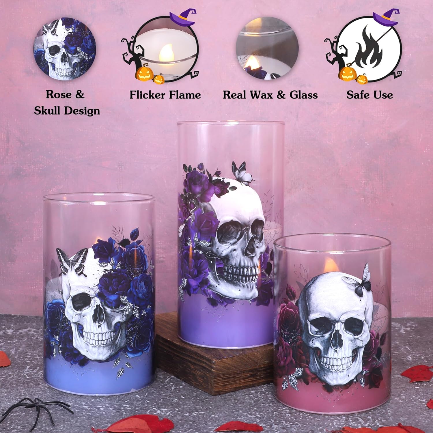 | Subject Character | Cylindrical glass tube with built-in flicker wick and paraffin wax material look realistic candle, with big skull & butterfly & rose design affixed to the surface. |