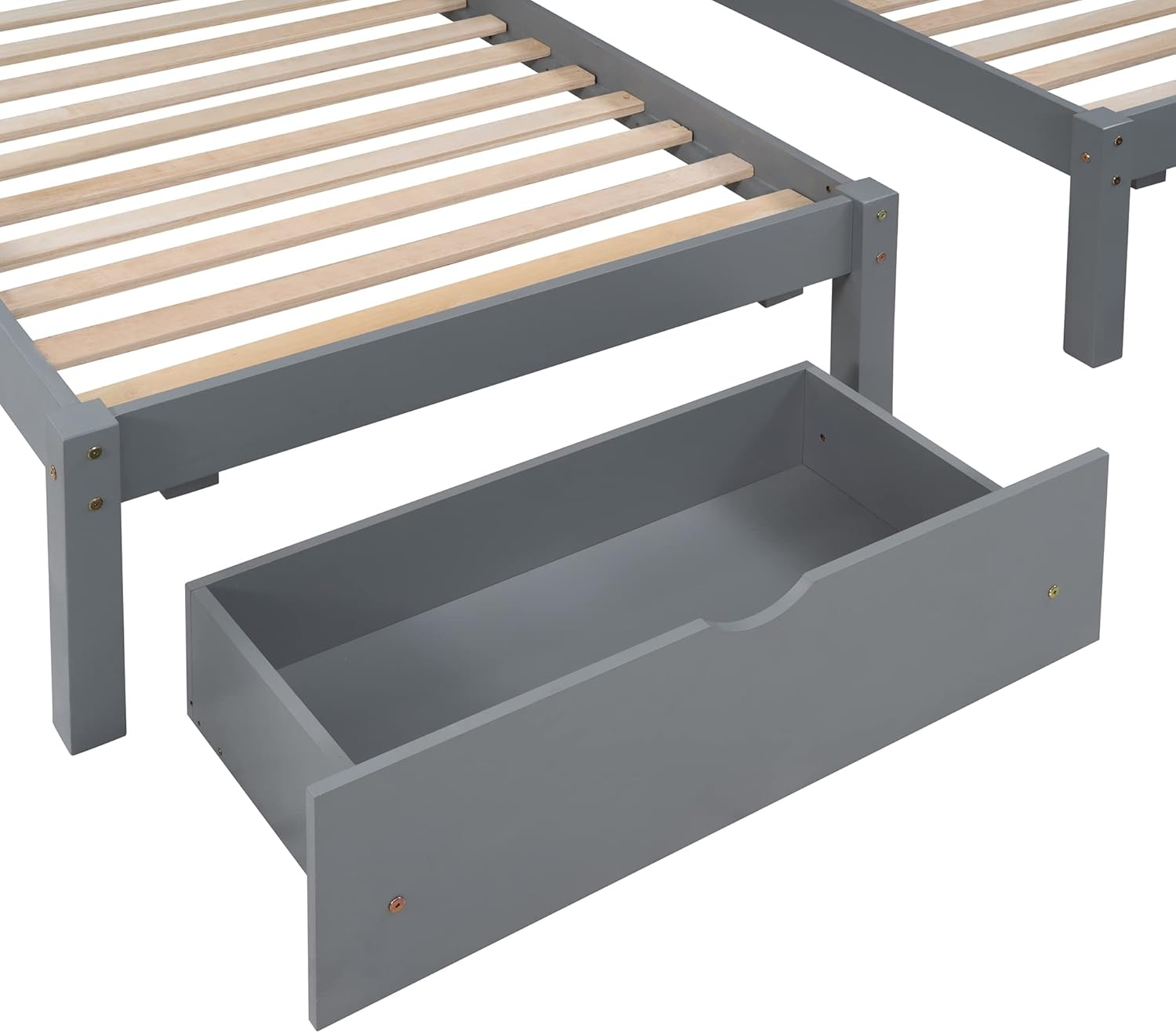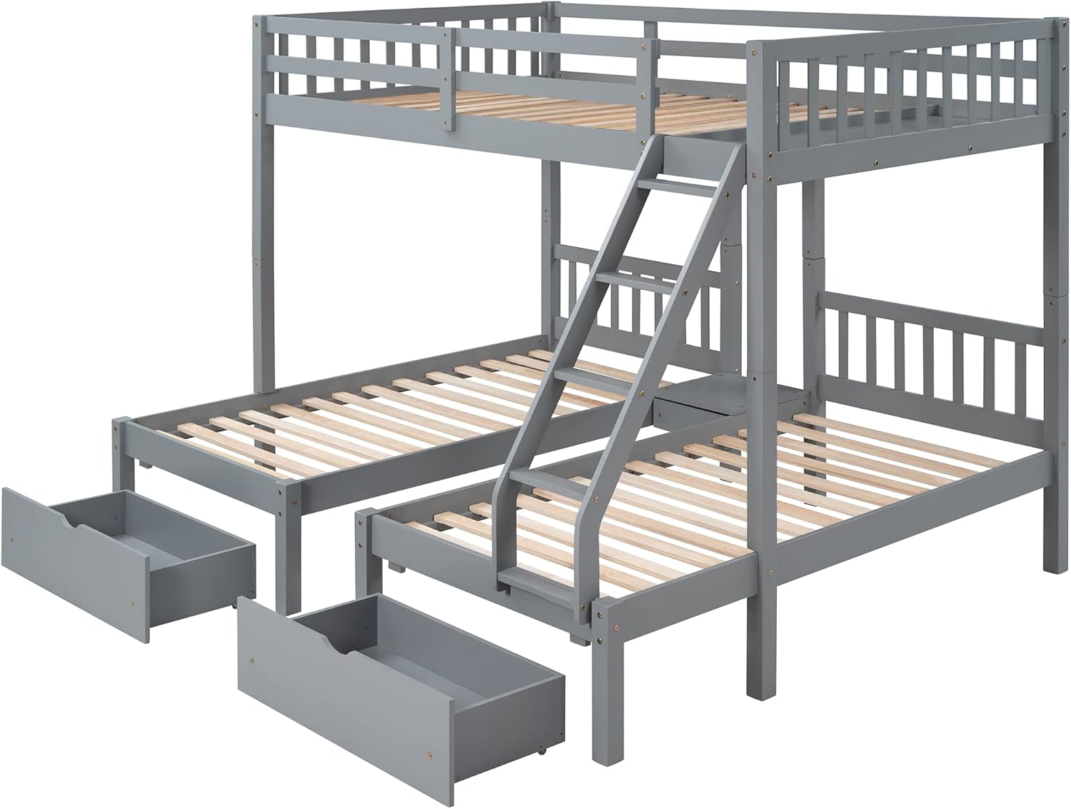 Full Over Twin & Twin Bunk Bed, Wood Triple Bunk Bed with Drawers and GuardrailsMain features Combined with one full bed and two twin beds, this triple bed is perfect for many children family or spontaneous sleepover guests.This triple bed can be divided into three separate beds to meet your different needs.The two pull-out drawers under the lower beds save a space and for you to store some daily supplies.The full-length guardrails of the upper bed are equipped to protect your kids from accidental falls to keep them safe and secure during sleep. The angled ladder makes it easy for children to climb up and down from the upper bed.This bed features a sturdy high-quality solid wood construction for durability and strength, ensuring longevity. A gray finish enhances the smooth lines and add a contemporary feel to any room set aside for multiples to sleep.Weight & DimensionsOverall Product Dimension: 96.8"L*80"W*69"H Overall Product Weight:275lbs Upper bed Weight Capacity:Upper bed: 250 lbsLower bed Weight Capacity: 275 lbsUpper bed Recommended Mattress Thickness: 6"Lower bed Recommended Mattress Thickness: 8"Number of Package: 3SpecificationsProduct Type: Full Over Twin & Twin Triple Bunk BedSize: Full / TwinColor: White/GrayMaterial: Plywood+PinewoodBox Spring Required: NoAssembly Required: YesNotesManual measurement has been used,there may be some reasonable error.Assembly required, we have provided clear instructions and tools. Mattress sold separately.
