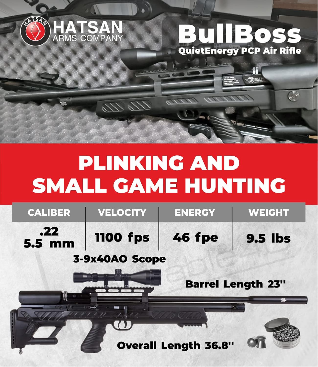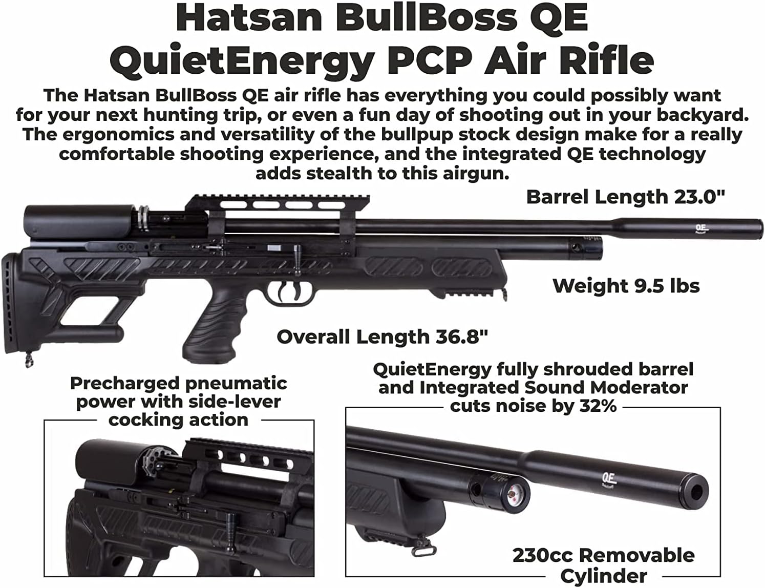 The Hatsan BullBoss QE Air Riflehas everything you could possibly want for your next hunting trip, or even a fun day of shooting out in your backyard. The ergonomics and versatility of the bullpup stock design make for a really comfortable shooting experience, and the integrated QE technology adds stealth to this airgun. Fully loaded with practical features like the Picatinny rails, detachable air cylinder, anti-double pellet feed and 2-stage adjustable trigger, get yours today and enjoy the accuracy, power and speed you've come to expect from Hatsan. KEY FEATURES: QuietEnergy fully shrouded barrel and Integrated Sound Moderator – Approximately 50% Quieter 230cc Removable Cylinder Quattro Trigger Combo Scope Rail (11mm and 22mm) Rotary Magazine Easy To Use Side Lever Action SPECS: Loudness: 4-Medium-High Barrel Length: 23.0" Overall Length: 36.8" Barrel: Rifled Scopeable: Weaver/Picatinny Trigger: Two-stage adjustable Buttplate: Adjustable Suggested for: Small game hunting/target practice Action: Sidelever Safety Automatic Powerplant: Pre-charged pneumatic Function: Repeater Body Type: Bullpup Fixed/adj. power: Fixed Cylinder Size: 230 cc Weight: 9.5 lbs Enjoy!
