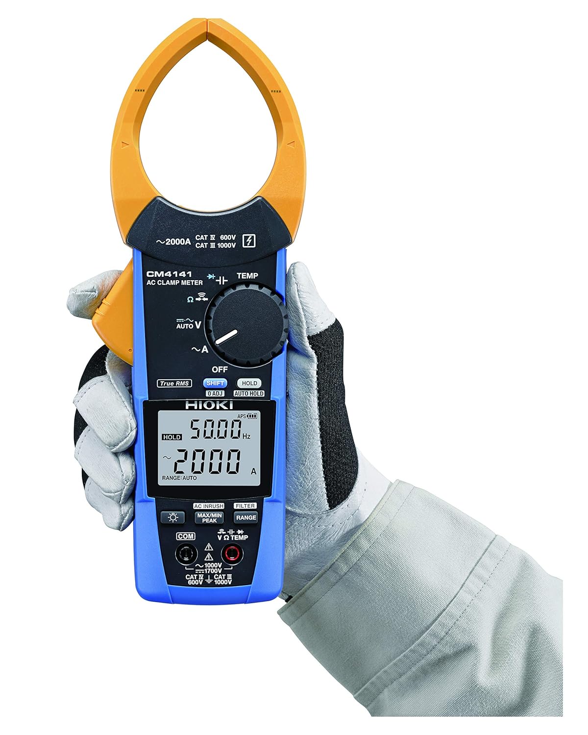The Hioki CM4141 clamp on meter is a best-in-class measuring device incorporating Hioki's expertise in current sensing technology. The CM4141 is a 2000A AC True-RMS clamp meter that features a uniquely designed slim jaw that lets you easily get into the narrow gaps between cables in crowded electrical distribution boxes without fear of damaging the cables or the clamp meter. The broad -25° to 65° operating temperature range and IP50 dustproof and waterproof enclosure to enable professionals to work quickly in crowded electrical distribution panels. The high current measurement capability makes it especially useful for industrial applications.|Newly Designed Clamp Sensor Gets Between Wires Even with Large Jaw Diameter|Despite the ability to measure up to 2000A AC afforded by the large sensor with φ55mm core diameter, the clamp meter’s innovative jaw design lets you get between the narrow spaces between crowded cables with absolute ease. In addition, electrical panels are sometimes so crowded that you need to push and pull to the clamp to get it around the cable. The CM4141 features a robust construction that delivers strength while letting you weave through complex wiring to get to the right cable, vastly improving work efficiency and speed.|Compared with clamp meters of similar class, the meter weighs only 300g, at least 100g lighter than competitors, letting you use the instrument over long work days with significantly less effort and physical strain.