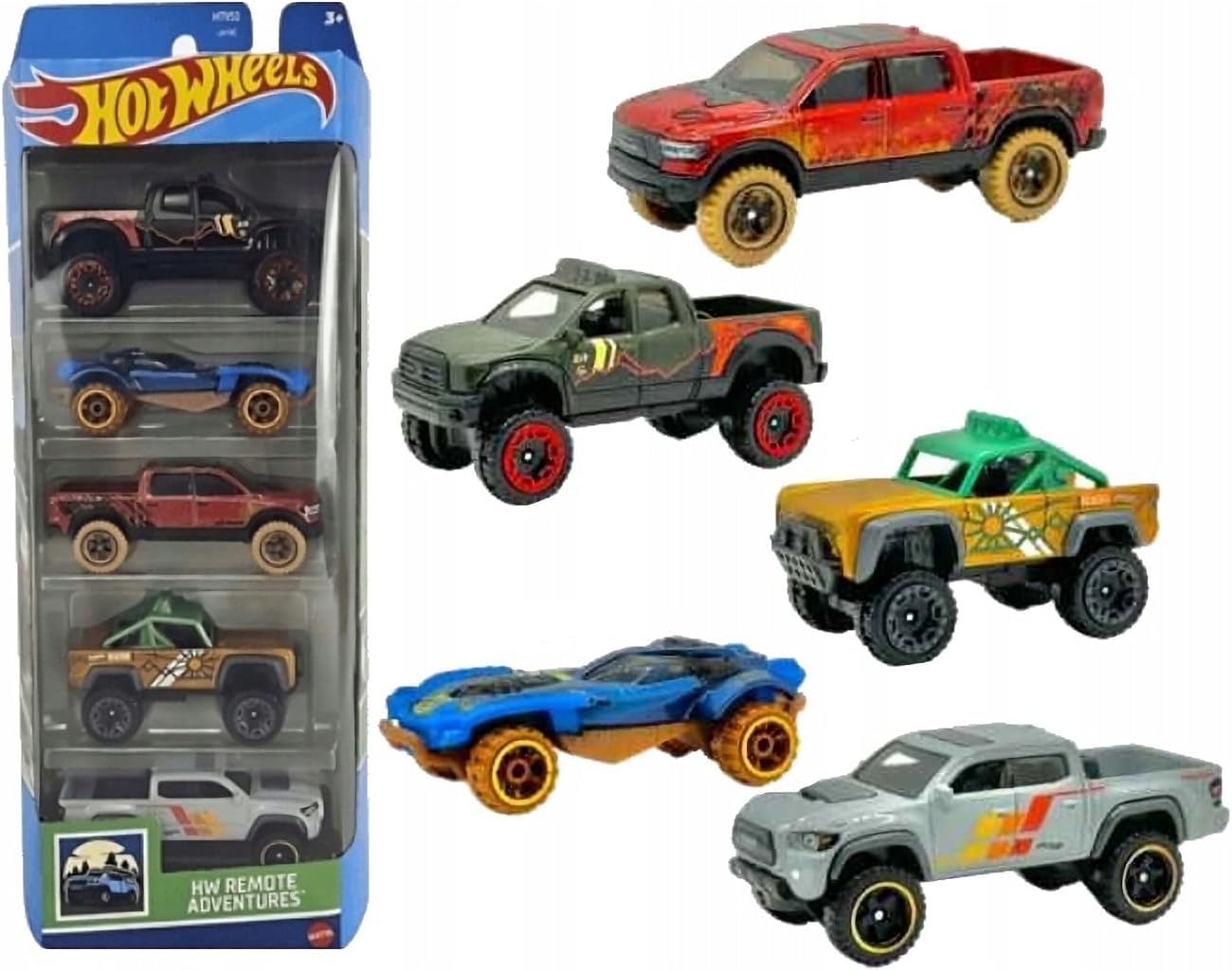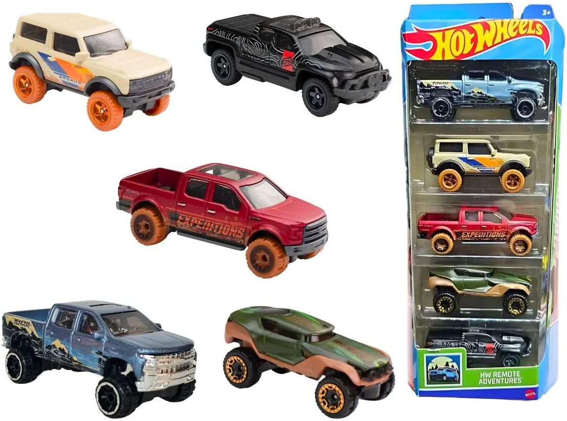 Take the trail less traveled with the Hot Wheels Remote Adventures Off‑Road Vehicle Collection. This 10‑car bundle includes two unique 5‑packs filled with lifted trucks, powerful 4x4s, and specialized adventure vehicles, all designed for extreme off‑road fun. Each 1:64 scale model features bold paint, rugged wheels, and detailed styling—from trail‑tuned SUVs to heavy‑duty dirt crawlers. Made from durable die‑cast metal and packed in clear window boxes, this set is built for both off-road play and collector display. Whether blazing dirt tracks or showcasing your favorite rigs, this collection delivers action in every direction. (2 x 5‑Packs) Vehicle Breakdown Remote Adventures 5‑Pack A – Includes 5 lifted or modified off-roaders with bold color schemes and adventure styling Remote Adventures 5‑Pack B – Features 5 unique 4x4s, trucks, and trail rigs with oversized tires and off-road tampos All models built in 1:64 scale die‑cast with clear display-ready packaging