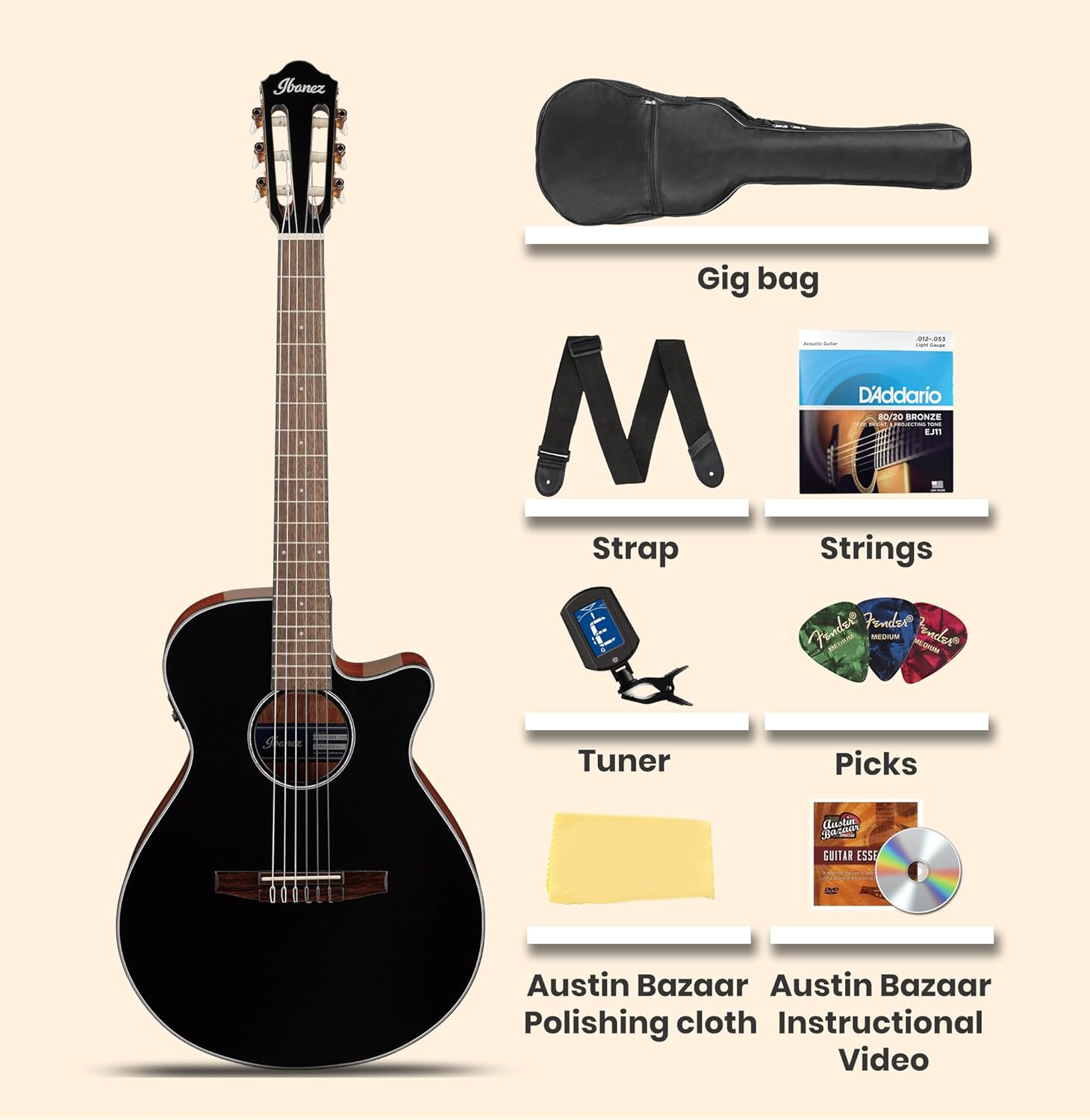 The Ibanez AEG50NBKH Acoustic-Electric Guitar is a sleek, single-cutaway instrument from the AEG Series, designed for comfort, easy playability, and outstanding acoustic performance, whether unplugged or amplified. Its slim body ensures extended playing comfort without compromising on sound projection, delivering a powerful and balanced acoustic tone. The guitar is equipped with the intuitive Ibanez AEQ-TTS preamp, featuring just two knobs, Volume and Shape, that allow quick tone adjustments from warm and mellow to bright and crisp. The onboard LCD tuner is easy to read, even on dimly lit stages. Constructed with Okoume back and sides, the guitar produces a woody, warm tone with punchy high-mids, ideal for both fingerpicking and strumming. The Nyatoh neck contributes a rich mid-low end, while the Laurel fretboard and bridge enhance warmth, sustain, and tonal richness by efficiently transferring string vibrations. With its visually striking Black High Gloss finish, this guitar is a versatile workhorse suitable for players of all levels, whether performing on stage or recording at home. Body Shape: AEG Body Top: Spruce Back & Sides: Okoume Neck: AEG Nyatoh Fretboard: Laurel Bridge: Laurel Inlay: White Dot Soundhole Rosette: Acrylic Tuning Machine: Gold Classical Tuners Number of Frets: 20 Strings: Ibanez ICLS6NT String Space: 11.6mm Pickup: Ibanez T-bar II Undersaddle Preamp: Ibanez AEQ-TTS w/ Onboard Tuner Output Jack: 1/4" Austin Bazaar appreciates your purchase by adding essential accessories. This bundle contains a gig bag to protect your guitar during travel, a tuner to keep your instrument in tune, a strap for comfortable playing, strings and picks for later use, an Austin Bazaar instructional DVD to provide tips and guidance, and a polishing cloth to keep your gear in mint condition.