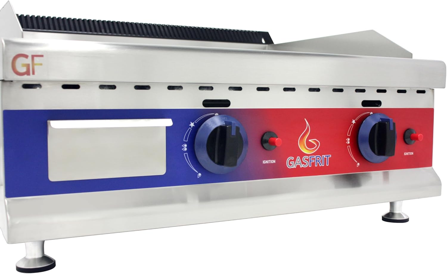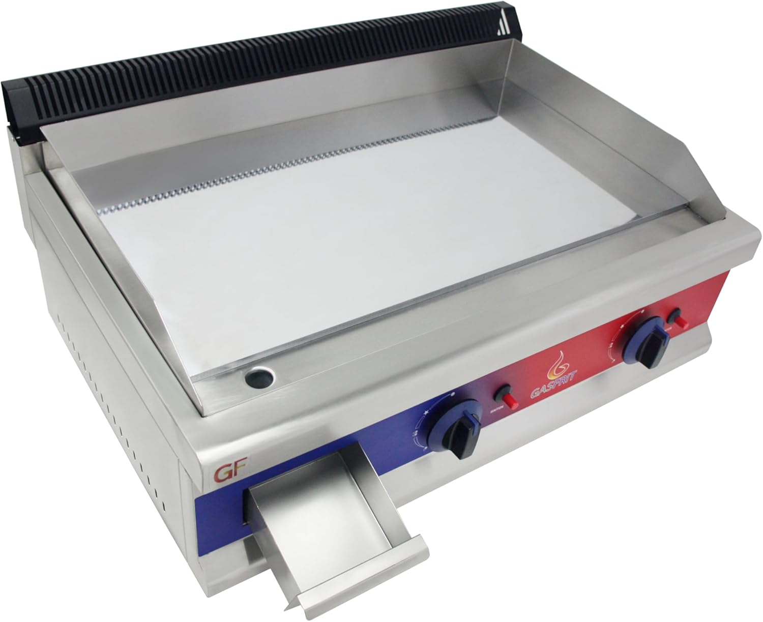 GASFRIT industrial griddles are designed for maximum performance in professional kitchens. Made of high quality stainless steel, they combine robustness, durability and a design designed to withstand long working days in restaurants, bars, hotels or fast food businesses. Its 16 mm hard chrome plate with 50 micron bath ensures excellent heat distribution, allowing you to cook meats, fish, vegetables or snacks with a perfect seal and lower energy consumption. The smooth surface facilitates cleaning and prevents stickiness, keeping the iron in optimal condition for longer. The gas-powered models incorporate high-efficiency burners, safety valves with flame control and piezo ignition, providing stable and safe power. In addition, they come predisposed for butane/propane and include injectors for conversion to natural gas. The electric model offers precise control via automatic thermostat adjustable between 50-300°C, perfect for continuous work with constant temperature. All variants include removable grease drawer, stainless bibs and reinforced structure. Its solid construction ensures stability even in high volume environments. GASFRIT griddles are a professional, reliable and efficient choice for any industrial kitchen looking for durable, powerful, and easy-to-maintain equipment.