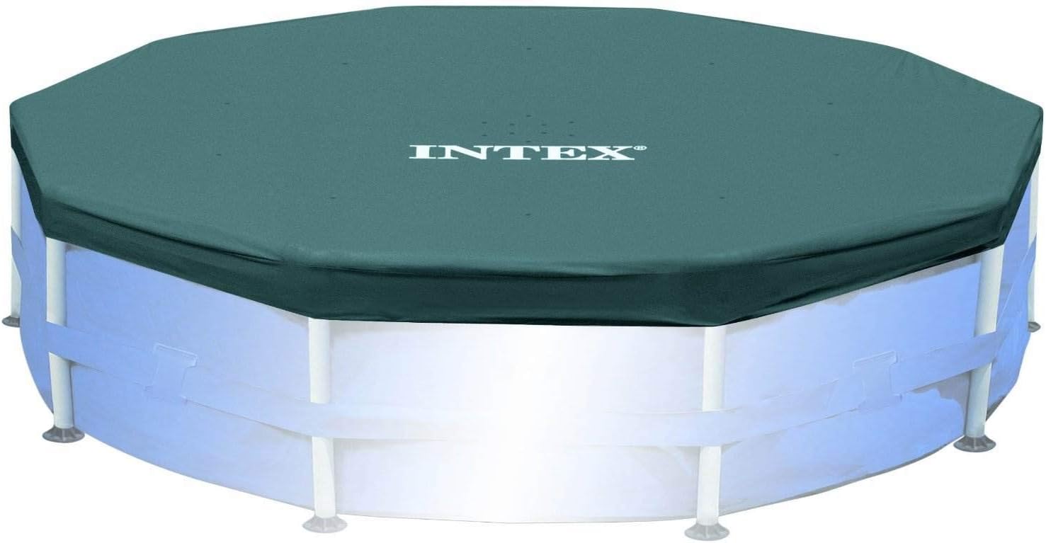 The Intex Prism Frame Pool is perfect for hosting all those backyard pool parties this summer. The upscale seafoam blue pool comes with an Intex model 28601EG cartridge filter pump and instructional DVD that helps you get the pool up and ready for water in just 45 minutes! Prism frame pools are enhanced with strong, powder-coated steel tubing. They're durable and still easy to assemble. The liner is stylish and constructed with puncture-resistant, 3-ply material for years of backyard fun. Start your summer off with a stylish above ground pool with the Intex Prism Frame Pool. Spend more time swimming in your pool this summer and less time cleaning it with this **Intex Above-Ground Pool Cover**. This cover fits securely around 10' pools and helps keep your pool free of dirt, insects and debris when not in use. It's ideal for pools with metal or hard plastic frames, and it's constructed of durable 7 gauge vinyl. This Above-Ground Pool Cover comes with a nylon rope that ties to hold the cover securely in place to prevent debris from falling into your pool.