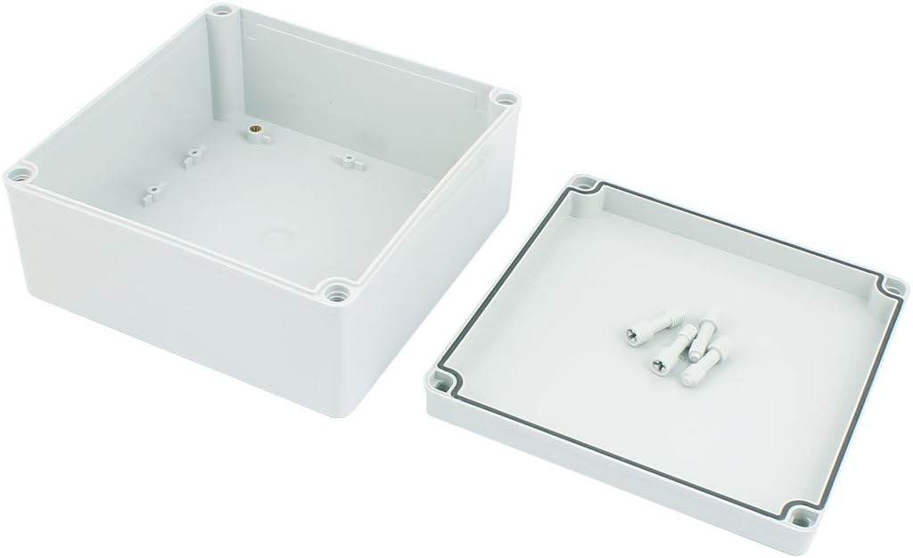 IP65 Junction Box DIY Terminal Connection Enclosure Adaptable 192mm x192mm x 87mmDescriptions:1. The screws on the lid are made from plastic so will not rust, and easy to turn.2. The sides of the box are plain to allow you to drill your own cable entries where needed.Features:* Inside Dimensions: (L)192 x (W)192 x (D)87mm* Solid PVC plastic grey halogen free construction* Plain sides, easy turn plastic screwsThis product provides complete protection against and few water, the Ingress Protection Rating is :IP65