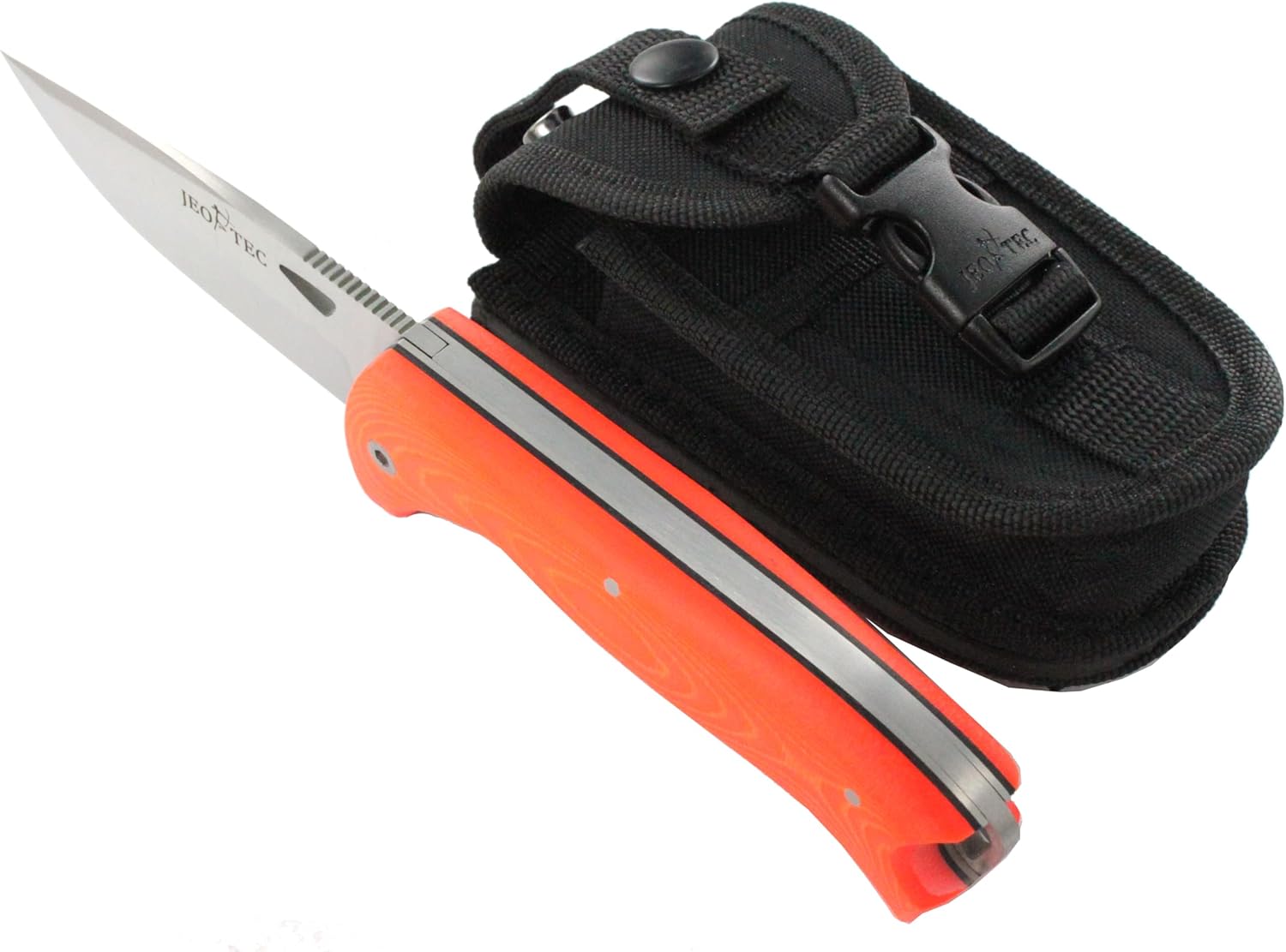 Explorers, hunters, fishermen and military live exciting experiences with our knives every day around the world. The JEO-TEC Nº47 folding knives, have been specially designed to be used in rough conditions and hard outdoor environmentsMain features: ✔ Blade Length: 100 mm / 3,93 inches ✔ Overall Length: 230 mm / 9 inches✔ Blade Thickness: 3,0 mm / 0,12 inches ✔ Stainless Steel Molybdenum-Vanadium 58 (MOVA-58) / HRC 56-58✔ Locks securely into place with liner lock mechanism. NOTE: This folding knife is not a spring-assisted or assisted open knife. ✔ Micarta handle (orange fluor)✔ Multi-position Cordura sheath. ✔ Designed in USA, Handmade in Spain, by expert craftsmen using very high quality materials. We specialize in heavy-duty knives: Bushcraft knife, Survival knife, Hunting knife, Tactical knife, Army knife. We also offer custom made knives for quantity orders (Minimum quantity: 25 units). ✔ Our products come with a lifelong guarantee, so should any of our knives be faulty or flawed due to material or manufacturing defects, we will replace it for a new one. Damage cause by the misuse, undue care or obvious wear through use will not be covered by this guarantee.