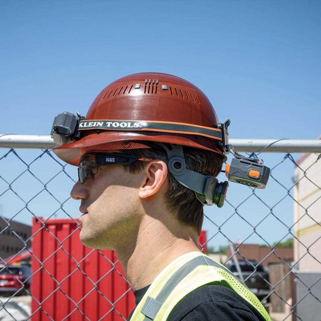 Klein Tools' Hard Hat Turbo Fan fits on the brim of most hard hats and safety helmets, and can also be used with the included dual-mount strap and mounting bracket for shells without a brim. The Hinged Adapter Bracket mounts directly to the accessory mounts on Klein Tools hard hats and safety helmets, as well as the Dual Mount Strap for hard hats without mounts. The fan is powered by Klein's Modular Battery (Cat. No. 29025). See battery instruction sheet for features and specifications.