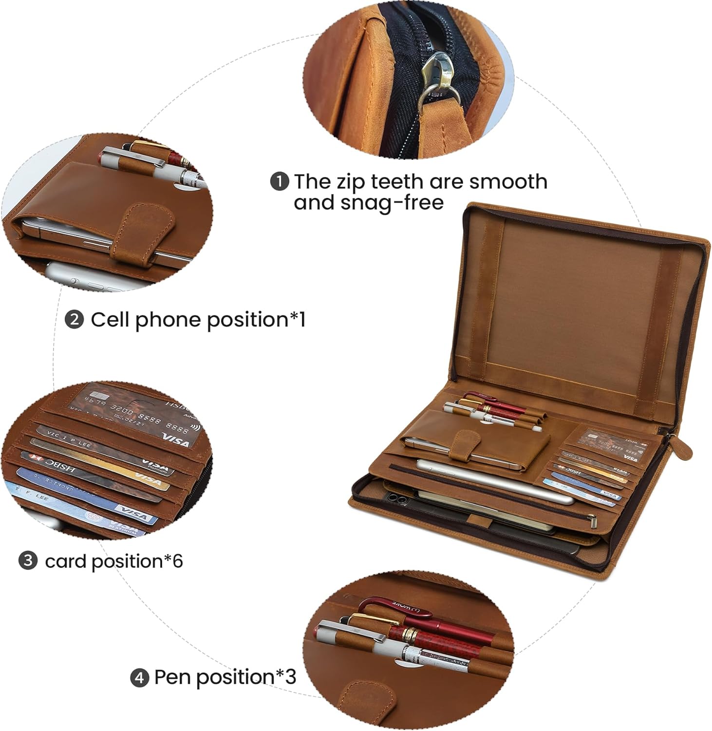 Experience the perfect union of rustic elegance and modern utility with our Genuine Crazy Horse Leather Portfolio, meticulously designed for the iPad Pro 12.9 inch. This isn't just a case; it's your mobile command center, safeguarding your technology and essentials while making a powerful style statement. Crafted from 100% authentic full-grain cowhide, our Crazy Horse leather is celebrated for its raw, unvarnished beauty. Free from artificial coatings, each portfolio tells its own story through natural textures and markings. As you use it, the leather develops a lustrous sheen and a patina that is uniquely yours, transforming it into a personal heirloom. Product Highlights: Precise Compatibility: Two dedicated compartments securely fit your iPad Pro 12.9-inch and other tablets up to 13 inches. Spacious & Organized Interior: Masterfully designed sections for A4 files, an A6 notebook, a smartphone, multiple pens, and cards. Premium Material: Authentic Crazy Horse cowhide leather that gains character and smoothness with age. Robust Construction: Reinforced stitching and quality zippers ensure long-term durability. Compact Dimensions: Measures 13" L x 9.8" H x 1.6" W, offering expansive storage in a sleek, portable profile. About The Crazy Horse Leather: Embrace the authenticity. The inherent scratches and variations on the leather surface are not defects but a hallmark of its genuine nature. This characteristic contributes to the rugged, vintage aesthetic that ages beautifully with time, making each piece one-of-a-kind. Ideal for the discerning professional who values both form and function, this portfolio is an investment in your personal and professional brand.