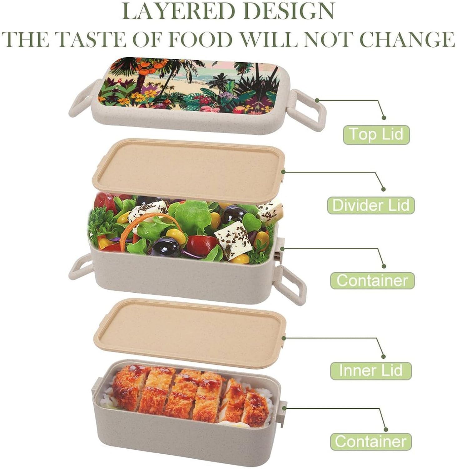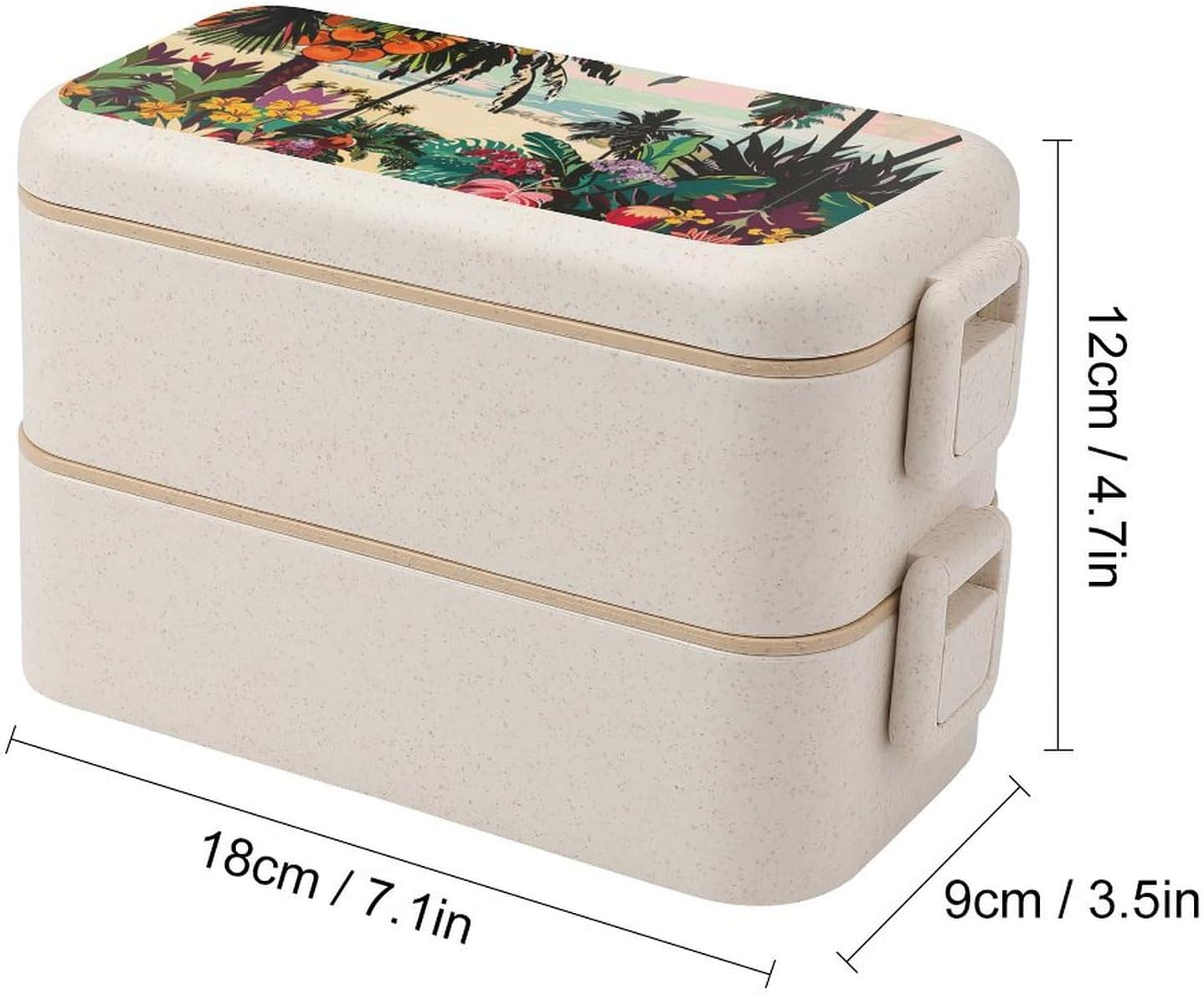 Fruit lunch box The food container is made of selected wheat fiber material,which will not emit other odors due to high temperature.It is a good helper for your daily life.The Tropical Floral Pattern printed food container adopts a partition design,which can separate different types of food,maintain the original flavor of the food,and plan your meal time reasonably.Integrated lunch box Small size and light texture,it will not feel bulky when put in a handbag or backpack during commuting.Portable lunch box The sealed design can reduce the possibility of accidental food spillage and odor escape,providing convenience for your dining.Travel snack box In addition to accommodating staple foods and side dishes,the large capacity can also be used to place other foods such as fruits and vegetables.Bento box set Washable and reusable.