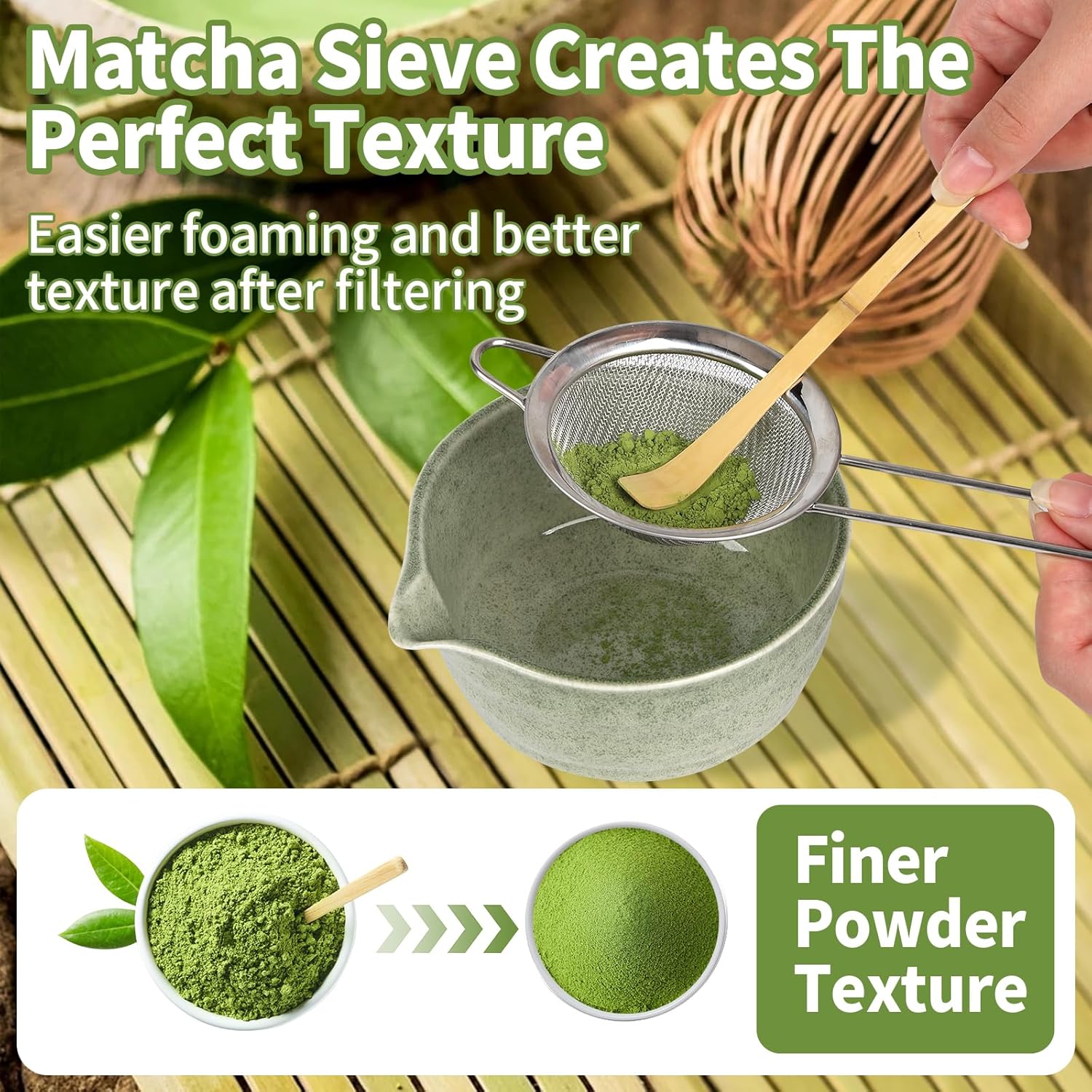 | Included Components | 1 x matcha whisk, 1 x stainless steel strainer, 2 x matcha spoons, 1 x ceramic matcha bowl, 1 x ceramic matcha broom holder |