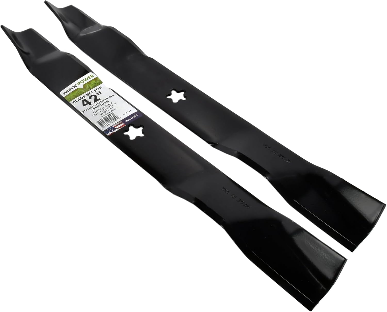MaxPower's 561742B includes (2) 3-N-1 style blades for many 42 in. cut Craftsman, Husqvarna, and Poulan mowers. These blades replace OEM #'s 139775 and 532139775. Each blade measures 21-1/16 in. L and 2-1/4 in. W with a 5 point star center hole. Check your owner's manual to verify that the OEM number of the blade being replaced matches one of the OEM numbers provided for this item. Maxpower blades are manufactured to meet or exceed OEM specifications. Proudly made in the USA.
