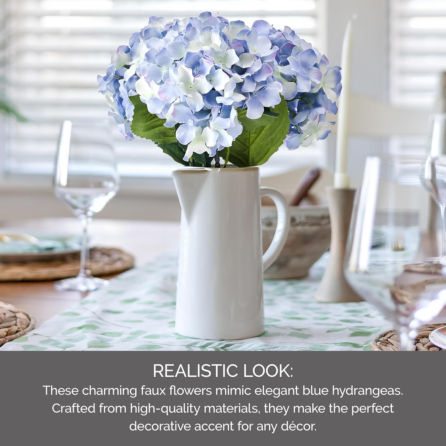 Bring the timeless beauty of fresh hydrangeas into your home without the worry of wilting or watering. The Mikasa 18-Inch Artificial Blue Hydrangea Stem is a thoughtfully crafted faux floral accent designed to add a touch of natural elegance to any space. Whether you are styling a dining table centerpiece, refreshing a bedroom corner, or adding color to a living room shelf, these realistic fake flowers deliver the serene, welcoming atmosphere of a fresh bouquet - day after day, season after season. Crafted from soft-touch polyester, each bloom is designed to replicate the layered, rounded clusters of real hydrangea flowers. The rich blue hue adds a calming, sophisticated note to your decor, pairing beautifully with neutral tones, whites, and earthy palettes. At 18 inches tall, these stems have a commanding presence that works equally well as a standalone stem in a tall vase or grouped together for a lush, full floral arrangement. The flexible wire stems make customization simple and intuitive. Bend, curve, or angle each stem to achieve the exact look you envision - whether that is a relaxed, organic cluster or a structured, symmetrical display. Arrange them in a classic ceramic vase, a rustic mason jar, or a modern glass vessel to suit your personal style and home aesthetic. For anyone who loves the look of fresh flowers but prefers a low-maintenance lifestyle, these artificial hydrangea stems are an inspired solution. There is no need to replace them weekly or worry about seasonal availability. Simply arrange them once and enjoy their lasting charm. They are also a wonderful option for spaces that do not receive much natural light, such as bathrooms, hallways, or offices, where real plants might struggle to thrive. Cleaning is straightforward - a gentle wipe with a damp cloth is all it takes to keep the petals looking fresh and vibrant. These faux flowers are also a thoughtful gift idea for housewarmings, birthdays, or any occasion where you want to give something beautiful and enduring. Mikasa brings the same commitment to quality and refined style found across its tableware and home collections to these decorative floral stems, making them a graceful addition to any well-curated home.