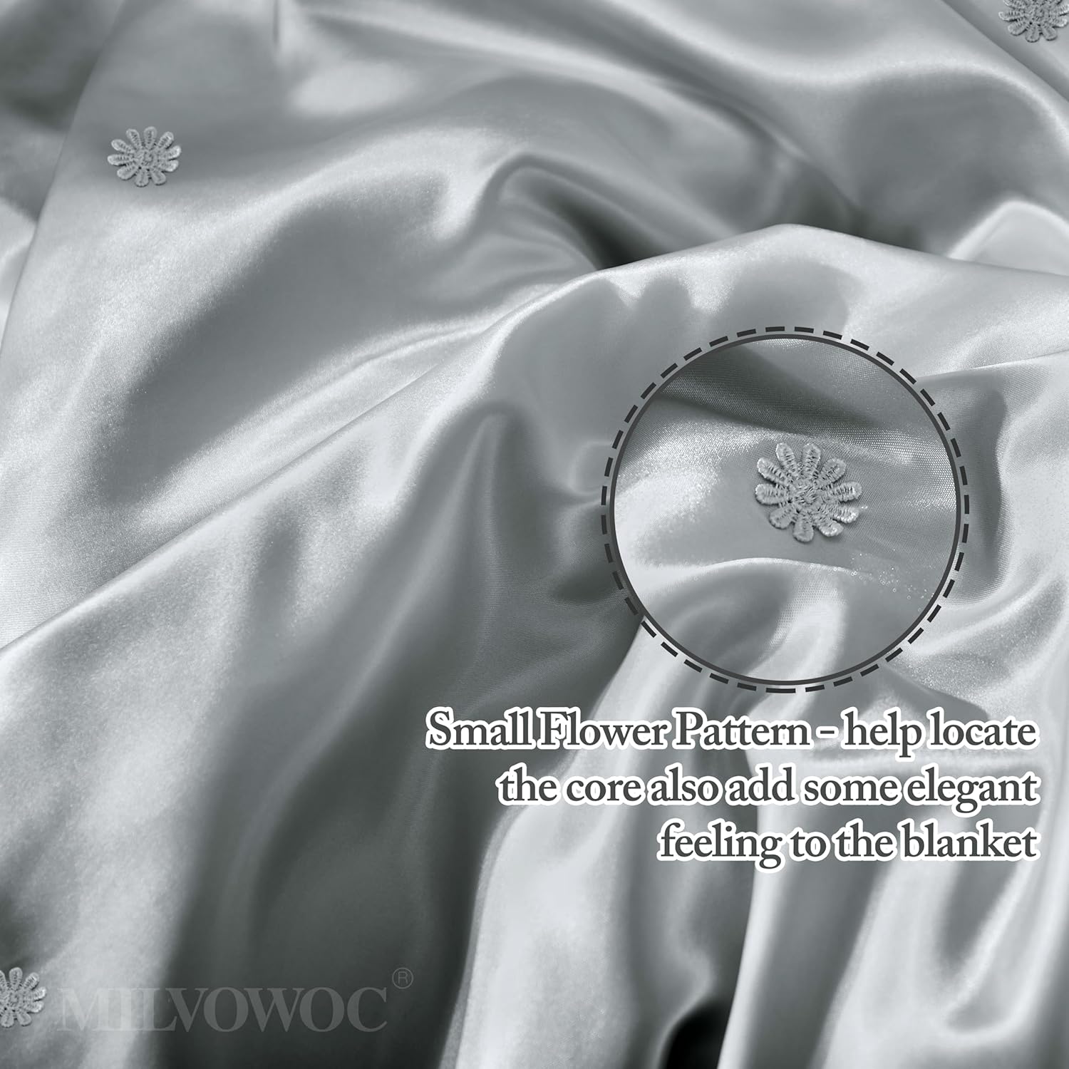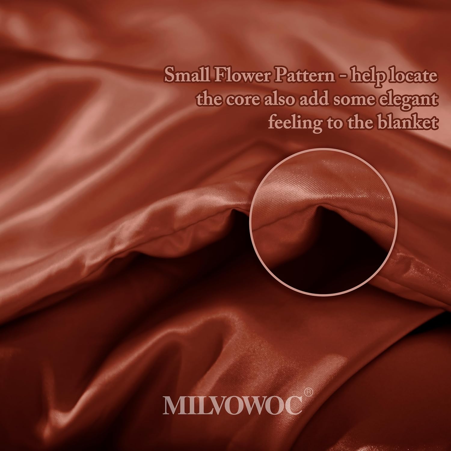 About MILVOWOC Satin Throw Blanket - As smooth as silk, you will be amazed at how soft and smooth the texture feels. - Surface is featured with small flower, while helping to locate the core also add some elegant feeling. - Satin fabric helps maintain the moisture balance of your skin, reducing friction and potential irritation. - Easy to carry, no matter where you are, keep you cool in summer and warm in winter. Specifications: Material: Stain (100% Polyester) Available Size: 60"L x 50"W, 60"L x 80"W, 90"L x 90"W; Multi-Colors: Light Grey,Blush Pink,Rust Orange,Beige,Forest Green,Silver Grey,Sage Green Notices: 1.The color of the item may slightly differ from the pictures due to variations in photography lighting. 2.Please avoid placing sharp objects such as earrings, rings, or hangnails on the blankets to prevent snagging the fabric.
