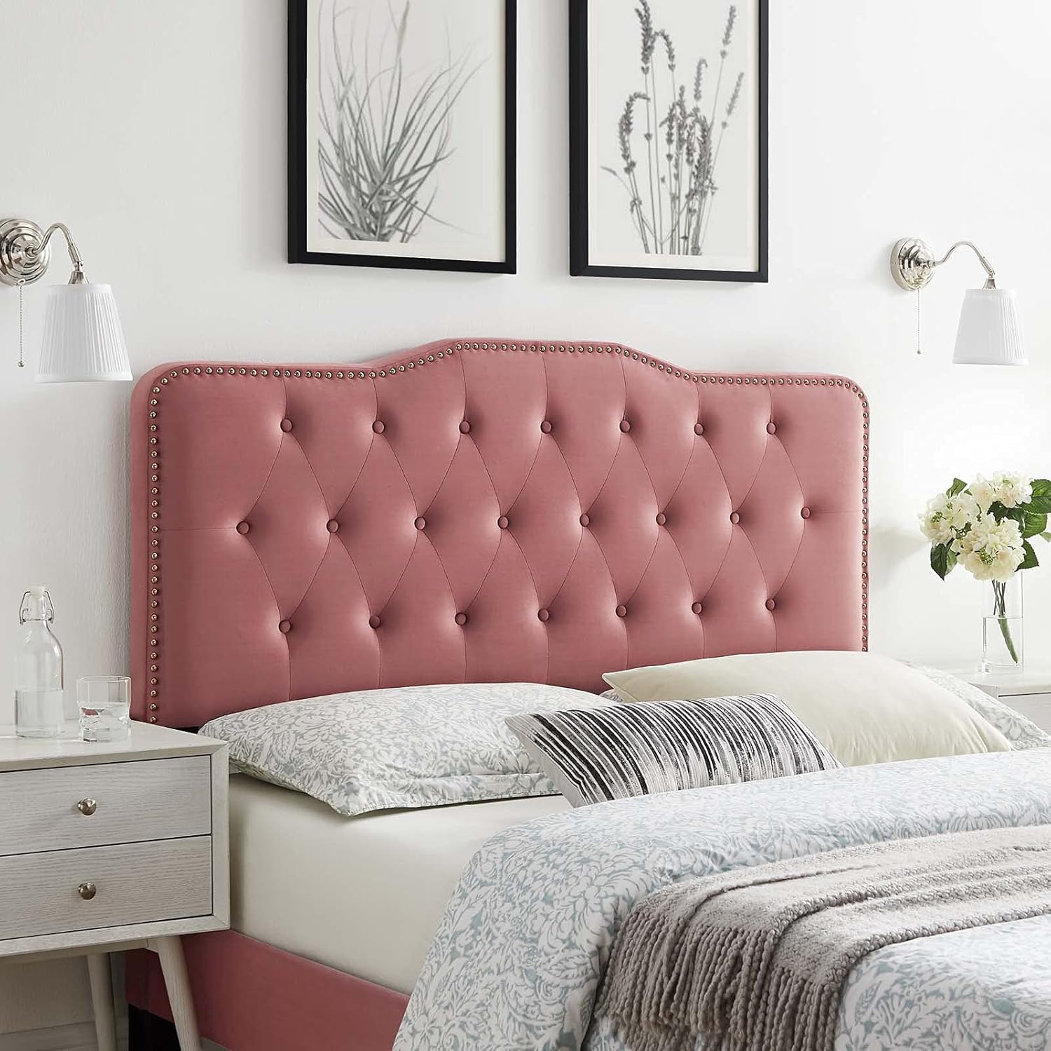 Refresh a kid's bedroom, guest room, or college dorm with the glam deco style and vintage modernity of the Sophia Tufted Performance Velvet Twin Headboard. Adorned with classic button tufting and framed with nailhead trim, this twin size headboard features a charming silhouette. Upholstered in stain-resistant performance velvet, this padded headboard offers supportive comfort while sitting up in bed resting and relaxing. An elegant addition to the bedroom, this height-adjustable headboard for twin bed frames is complete with five mounting positions. Assembly required.