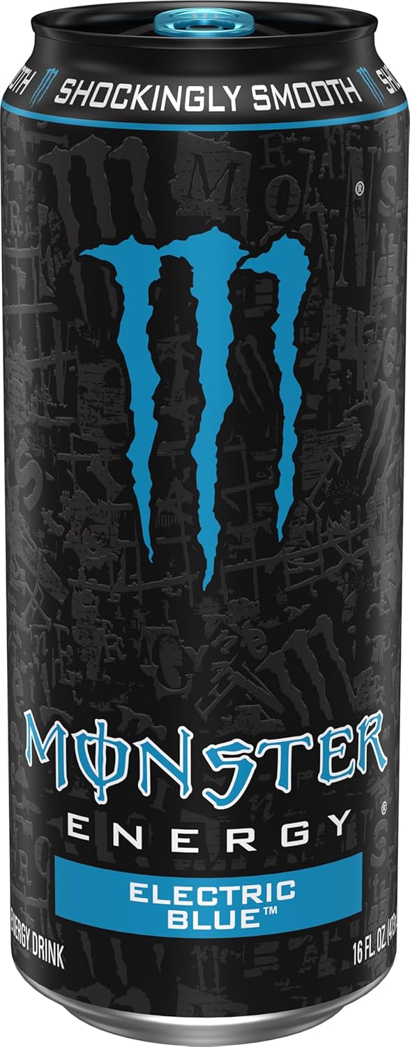 Drenched in our signature style, these cans pop with color and attitude— screaming Monster from every angle. The blue raspberry flavor is shockingly smooth. Made with real sugar and powered by the Monster Energy blend, Electric Blue delivers bold taste and electrifying energy.