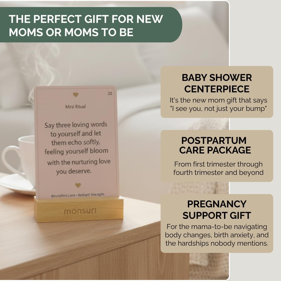 For the 3am Moments No One Prepares You For. It's 3:47am. You're 32 weeks pregnant and Googling "what if I can't do this" for the third night this week. Or you're two weeks postpartum, milk-stained and sobbing, not sure why. These 31 mom affirmation cards offer something different. Not advice. Not instruction. Just presence for the transformation nobody warns you about. What Makes MAMA GLOW Different From Other Pregnancy Affirmation Cards Most birth affirmation cards are passive reading - you look at pretty words and hope they sink in. MAMA GLOW pairs each affirmation with a 30-second ritual that engages your body, not just your mind. When you're tapping your chest and counting five heartbeats while saying "I trust my body's wisdom," your nervous system actually shifts. The physical action grounds the words during pregnancy anxiety, active labor, or postpartum overwhelm. What's Included in Your New Mom Affirmation Cards Set 31 affirmation cards covering themes of self-love, bonding, grace, and growth throughout your maternal journey How to Use Your Birth Affirmation Cards Keep the deck on your nightstand starting in early pregnancy. Each morning (or whenever you remember), draw one card. Read the affirmation aloud (yeah, actually say it). Do the 30-second ritual on the back. That's the whole practice. Some mamas work through the deck in order. Others shuffle and draw randomly. Some keep a favorite card in their robe pocket for days when they need it on repeat. There's no wrong way - the goal is comfort and mental health support, not completion. Perfect For: Baby Shower Gifts, Postpartum Care Packages & Self-Care Whether you're shopping for baby shower gifts for mom, building a postpartum care package for a struggling friend, or treating yourself during pregnancy, these affirmation cards for new moms arrive ready to give.