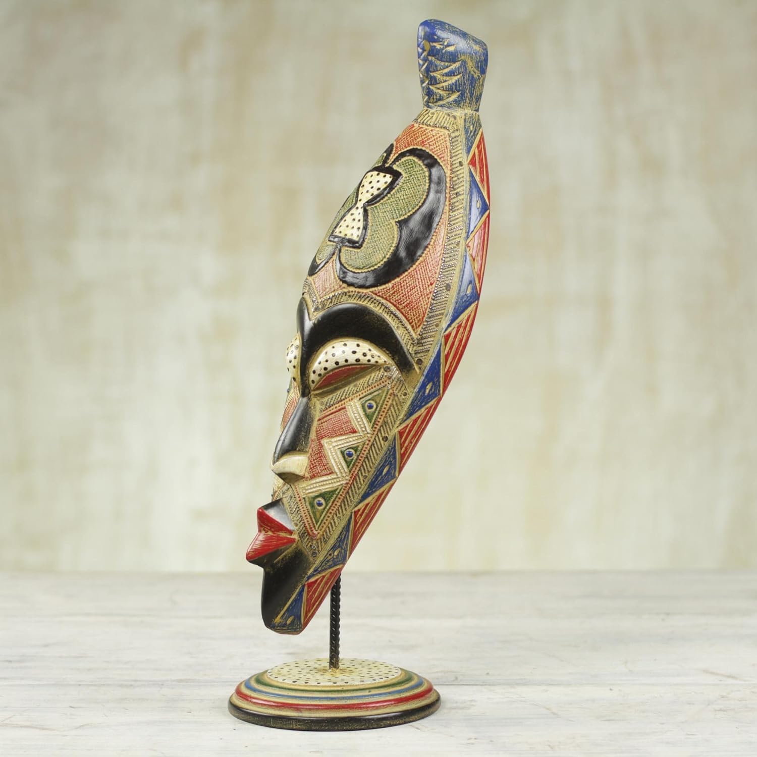 Designed and hand-carved out of sese wood and aluminum by artisan Daniel Quarcoo of Ghana, this mask is festively adorned with bright colors and a variety of patterns. On the mask's forehead is the Adinkra symbol for unity that reminds us that unity lies in strength and community. The artisan names the mask Morkporkpor, which means "one who makes a way" in the Ewe language.