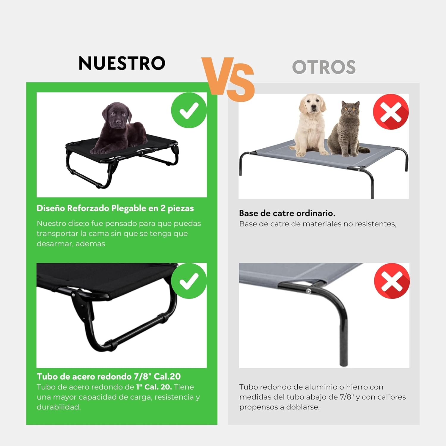 Our Small Breed Pet Cot, is designed especially for indoor and outdoor pets rest. It is made of a 7/8 gauge 20 gauge steel frame in bright aluminum color, has galvanized finish that prevents corrosion and long product life. Equipped with a laminated polyester canvas, this cot offers exceptional strength, supporting up to 40 kg of weight to ensure the safety of your pet. It has 2 folding tubular legs (one at each end) and its canvas is removable and washable, 100% polyester.