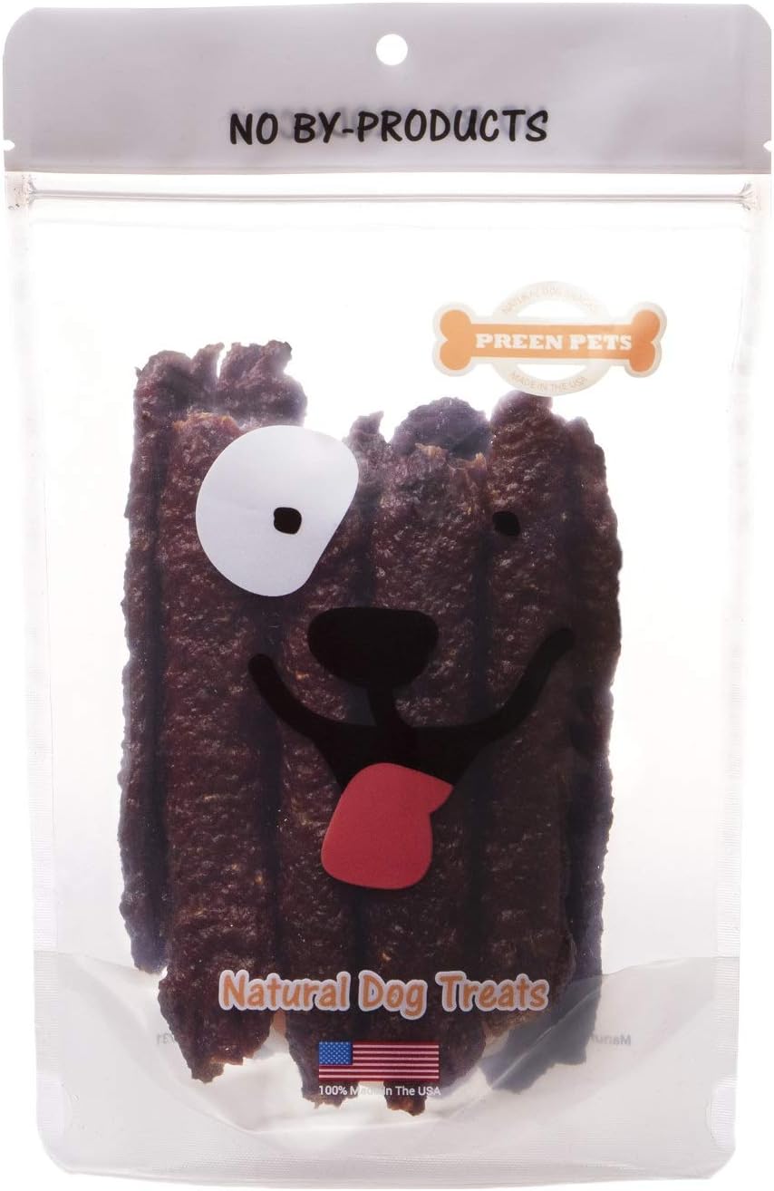 Our new Just Chicken Jerky is made with whole chicken and chicken liver. We add vegetable glycerin (made from plant oils) to make the jerky strips very soft and bendable. This jerky is perfect for dogs who can’t chew harder treats.