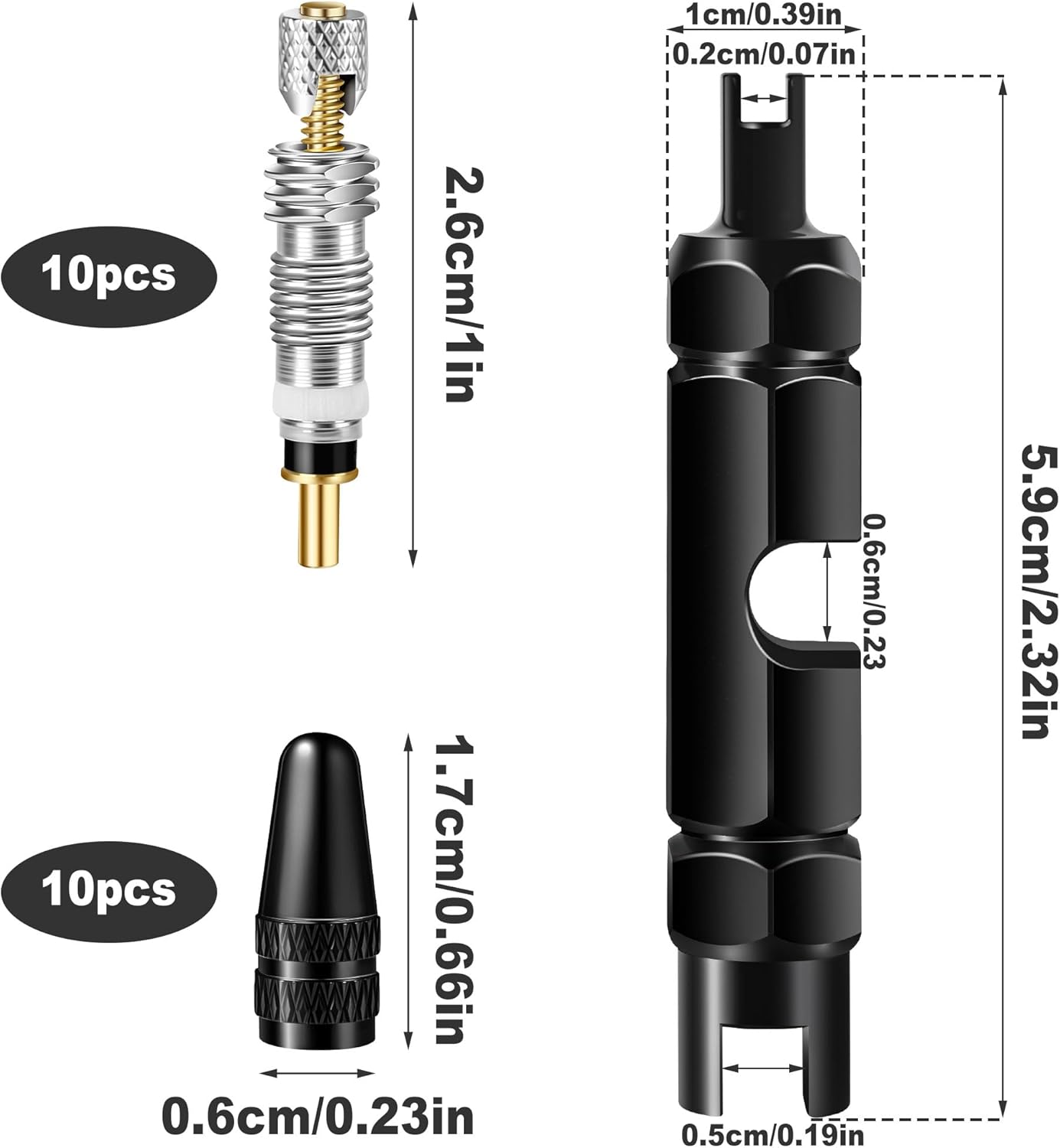 | Included Components | 10pcs Presta Valve Caps, 10pcs Presta Valve Cores, Tubeless Valve Stem Kit, Valve Core Remover |