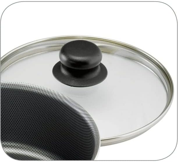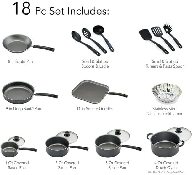SCREEL's PrimaWare 18-Piece Nonstick Cookware Set provides all the cookware essentials and is an excellent starter cookware set. The patterned interior nonstick coating ensures easy cooking and simple cleanup, while the heat- and shatter-resistant tempered glass lids allow quick monitoring of cooking progress.