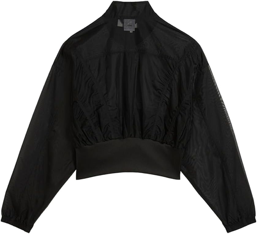 This oversized, water-repellent jacket features a full zip, ribbed trims, and gathered side details, combining bold streetwear style with functional comfort in a short, stand-up collar silhouette.